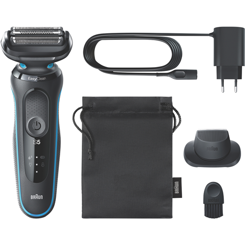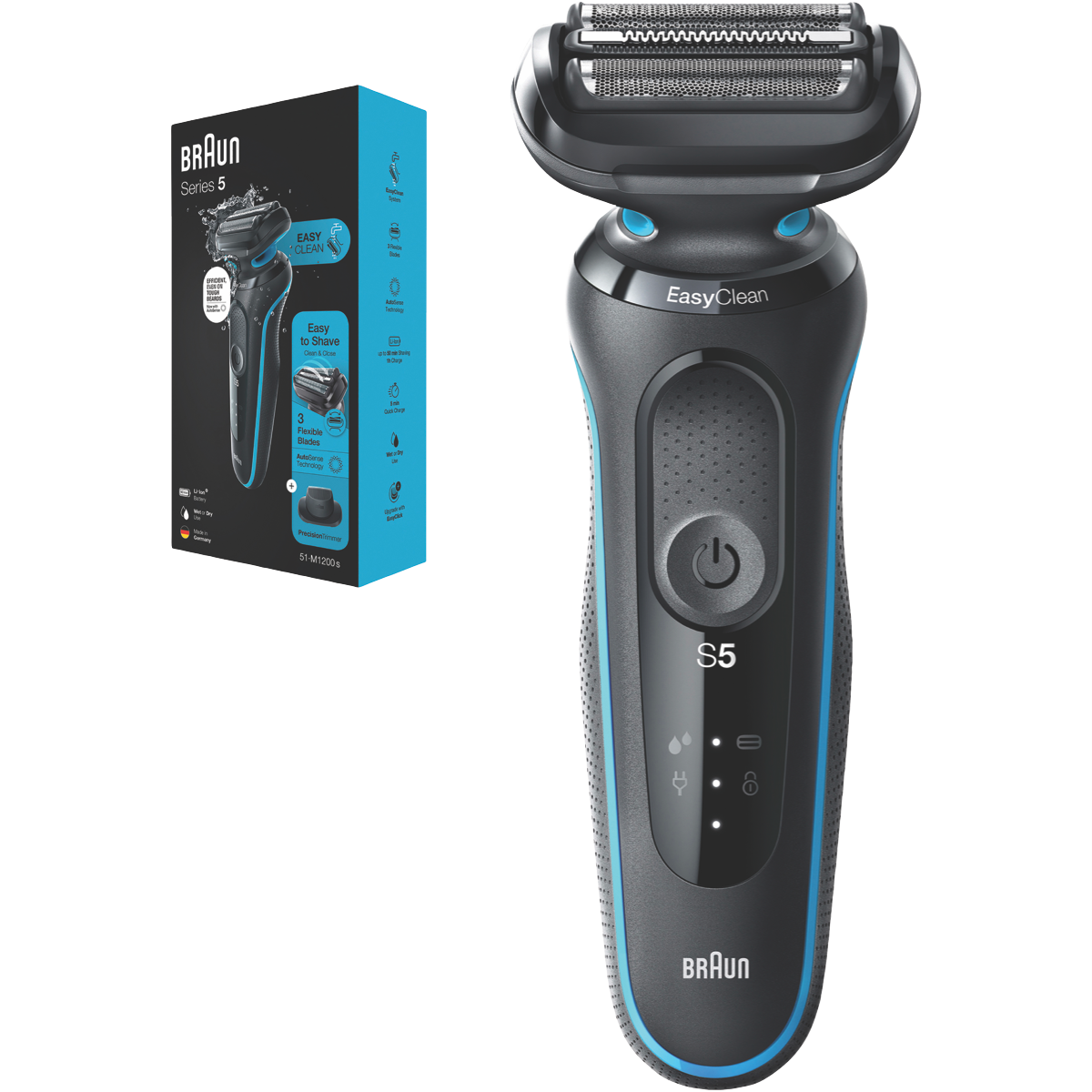 Experience a comfortable close shave with the Braun Series 5 Electric Shaver. This rechargeable electric razor delivers a precise efficient shave wet or dry thanks to its fully waterproof design and AutoSense technology that adapts power to your beard density. The long-lasting lithium ion battery provides up to 3 weeks of cordless shaving on a single charge. Plus a 5 minute quick charge delivers enough power for one full shave. With three flexible foils that contour to your face along with an integrated precision trimmer this electric shaver captures more hair in every pass for an effortless irritation-free shave. Additional features like the EasyClean system make cleaning simple while the sleek ergonomic design provides a comfortable grip. Backed by Braun's 2 year warranty this shaver is built to last. Treat yourself to a close comfortable shave and order the Braun Series 5 Electric Shaver today. The manufacturer's part number for this product is 51-M1200S.