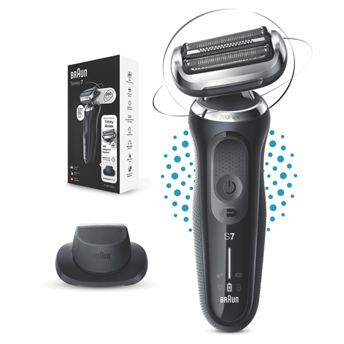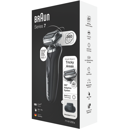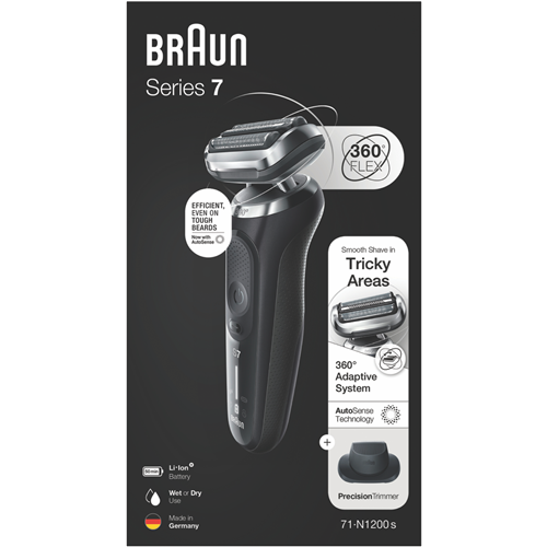 Bring the barbershop home with the Braun Series 7 Wet And Dry Shaver. This electric razor delivers a precise efficient shave whether on dry skin or with foam or gel. The fully waterproof design allows a refreshing wet shave in the shower. Equipped with AutoSense technology the shaver adjusts power based on beard density for optimized skin comfort. The Li-ion battery enables up to 3 weeks of runtime between charges and provides enough power for one full shave after only a 5 minute quick charge. With a sleek black finish LED display and ergonomic design Braun's latest shaver handles all shaving needs. The 360° Adaptation captures every hair in hard to reach areas. Simply glide the floating blades over skin for an effortless close shave. The integrated precision trimmer attachment perfects edges around your beard sideburns and moustache. Treat yourself to the ultimate shaving experience. Braun includes a travel case cleaning brush SmartPlug and soft pouch so you can maintain your shaver on-the-go. Backed by a 2 year warranty this electric shaver will be your daily companion for smooth comfortable shaving for years to come. The manufacturer's part number for this product is 71-N1200S. Bring home the Braun Series 7 for the ultimate shave.