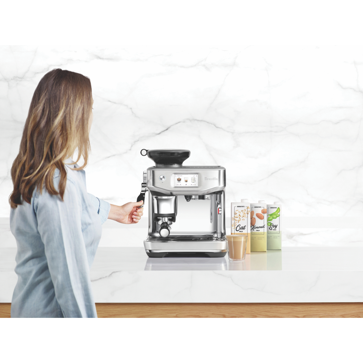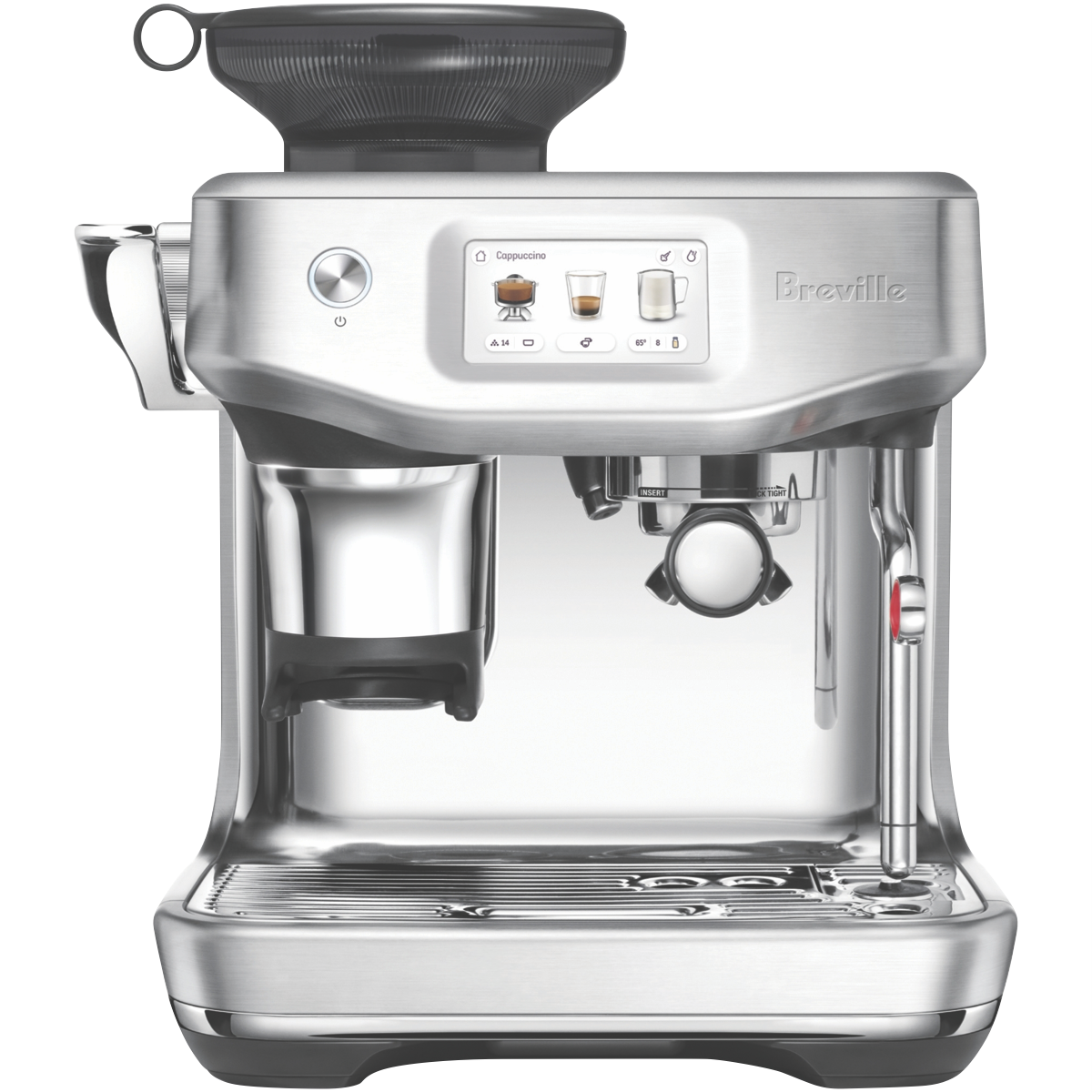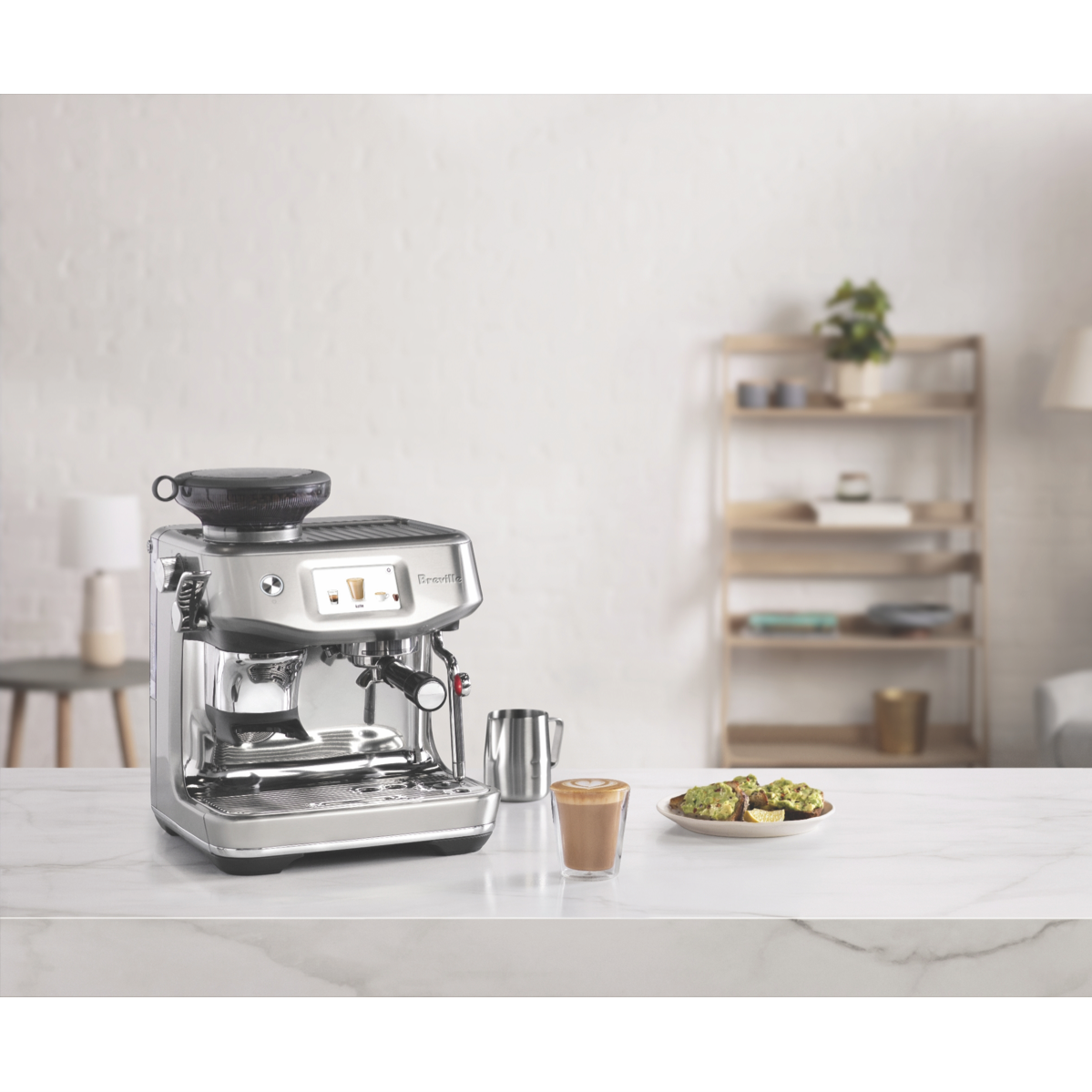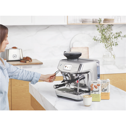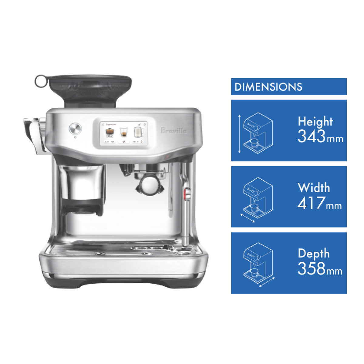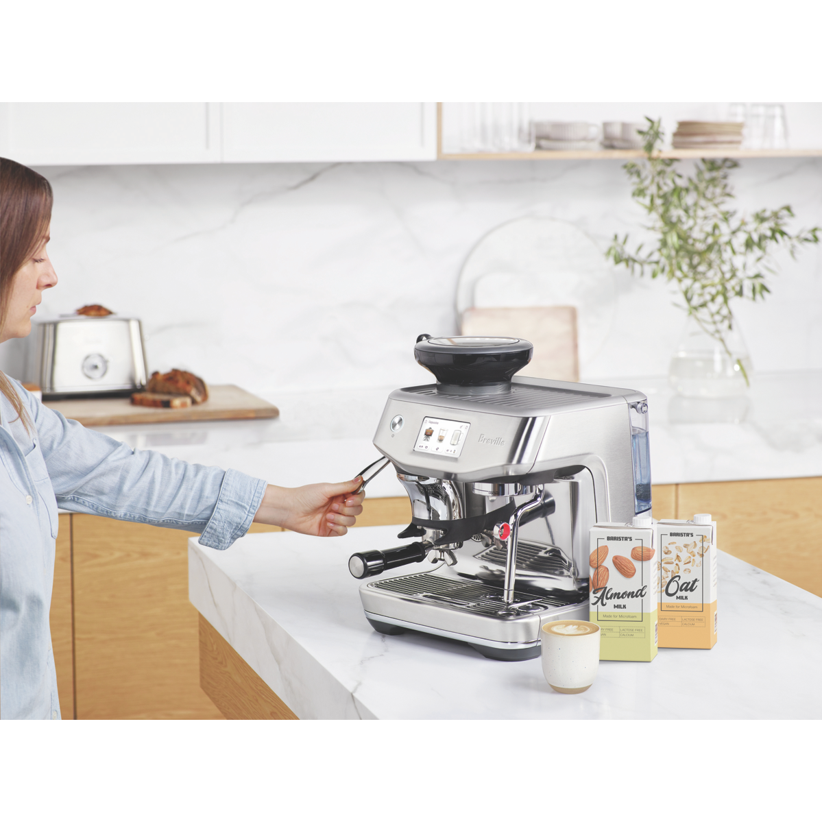 Upgrade your home coffee experience with the Breville Barista Touch Impress Brushed Stainless BES881BSS2IAN1. Step by step progress is easy with an updated full colour touchscreen and real time feedback from the Impress Puck System precisely extracting at 93 degrees celsius and creating silky smooth milk microfoam. Choose between manual or automatic tamping with 10kg of force finishing with a 7 degree barista twist along with auto correction of the next dose for precise dosing everytime. Discover the Auto MilQ steam wand offering alternative milk settings for almond oat and soy that calibrates pressure temperature and timing for automatically amazing frothing. Thanks to ThermoJet Heating you can start brewing in as little as 3 seconds and enjoy just the right grind with Baratza European precision burrs. Load up the 340 gram bean hopper with ribbed design allowing full flow or make a simple cup of tea with the dedicated hot water spout.