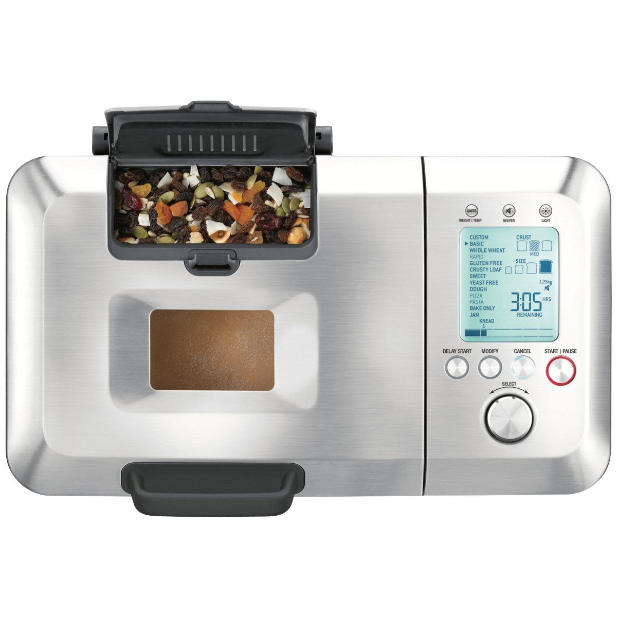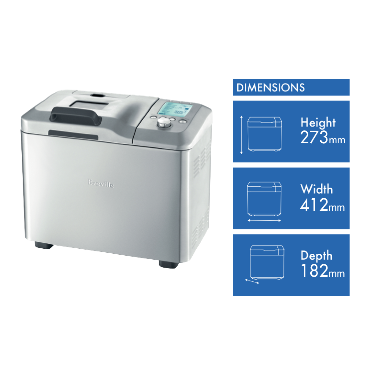 Freshly baked bread at home has never been easier with the Breville Bread Maker. This brushed stainless steel bread machine takes the work out of making delicious loaves with 13 automatic settings and 9 custom options to choose from. Bake a 500g 750g 1kg or 1.25kg loaf with ease using the non-stick coated bread pan. Get the perfect crust every time with 3 crust colour settings to pick between light medium and dark. The 830W motor and smart LCD display ensure reliable bread making while features like the automatic raisin and nut dispenser preset timer and power interruption protection give you total control. With a compact design standing just 273mm tall 412mm wide and 182mm deep the Breville Bread Maker will look great on any kitchen countertop. Whip up loaf after loaf without any fuss and enjoy the taste of freshly baked bread any time you like. This versatile bread machine comes with a 2 year manufacturer's warranty for added peace of mind. The manufacturer's part number for this product is BBM800. Give your kitchen counter its best bread buddy yet with the Breville Bread Maker.