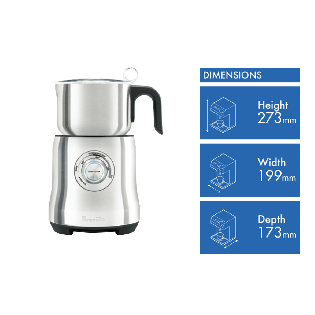 Transform your morning coffee into a barista-quality café beverage with the Breville Cafe Milk Frother. This stainless steel milk frother utilizes induction heating and temperature control to expertly froth milk for lattes cappuccinos and more. With a generous 3 cup capacity you can quickly make multiple drinks. The intuitive design includes dishwasher safe components and a measuring cap to easily add ingredients like cocoa powder when the mixing has started. Choose from latte and cappuccino frothing discs to customize your beverage texture and taste. The automatic shutoff provides peace of mind. With 500 watts of power this milk frother delivers fast consistent results every time. The induction heating system gently froths milk without scalding or burning. Make café-quality froth at home for lattes hot chocolates matcha and chai teas. The Breville milk frother includes everything needed to elevate your at-home coffee routine. Experience the joy of handcrafted espresso drinks topped with light creamy froth. The manufacturer's part number for this product is BMF600. Bring the café home with the Breville milk frother.