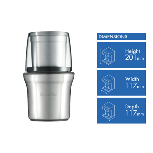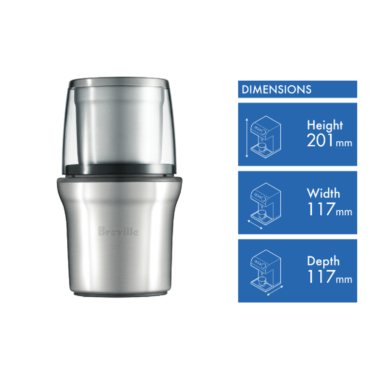 Take your morning coffee ritual to new heights with the Breville Coffee and Spice Grinder. This stainless steel grinder delivers fresh grounds in seconds unlocking richer coffee flavor for any brew. With one-touch operation an easy-clean bowl and blade removal system and dishwasher-safe parts this grinder simplifies the process of achieving café-quality coffee from the comfort of home. Whether using your preferred beans or spices the Breville's precision conical burrs provide fast even grinding for everything from espresso to French press. Measuring just 201mm high and 117mm wide and deep its compact size fits neatly on the countertop without clutter. Backed by Breville's 1-year warranty the BCG200 coffee and spice grinder makes it easy to grind beans and spices to extract maximum freshness and taste. The manufacturer's part number for this product is BCG200. Discover how simple it can be to grind your own beans and spices for unparalleled flavor and aroma with the Breville grinder.