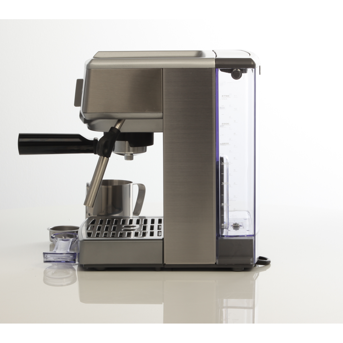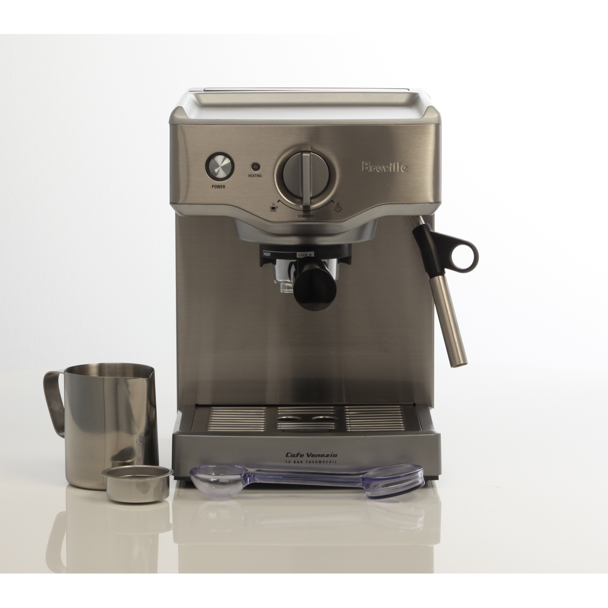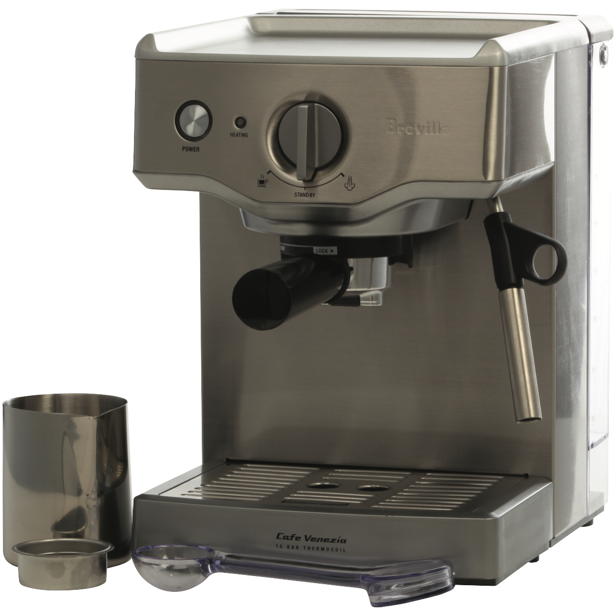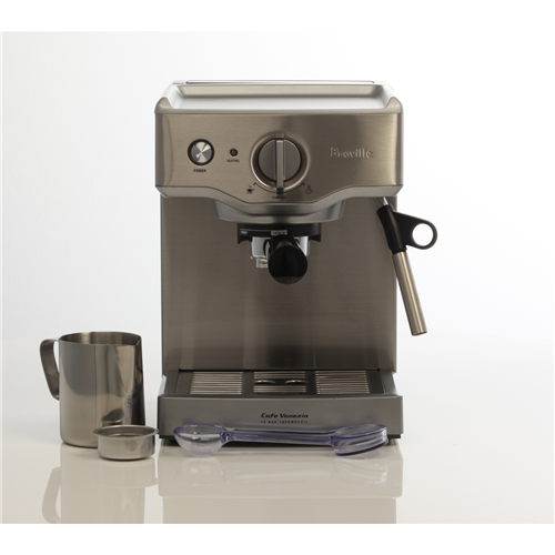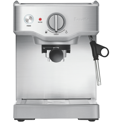 Take your coffee-making to new heights with the Breville Compact Cafe Espresso Machine. This sleek stainless steel manual espresso machine delivers cafe-quality coffee in a compact space-saving design. With a powerful 15 bar Italian pump and Thermocoil heating system it consistently pulls rich aromatic espresso shots and microfoam milk to craft lattes and cappuccinos at home. The dual wall filters assist in creating a thick smooth crema while the pre-brew function and dedicated hot water outlet optimize water temperature for espresso and americanos. Convenient features like the filter eject system steam wand purge and manual shot volume control put you in complete command of your coffee. Froth milk to perfection with the built-in stainless steel milk jug and frothing wand. Craft your favorite coffeehouse beverages in minutes then let the instant clean and auto-off functions handle the rest. Bringing sleek style and cafe capabilities to your countertop the Breville Compact Cafe Espresso Machine makes it easy to become your own barista. The manufacturer's part number for this product is BES250BSS.