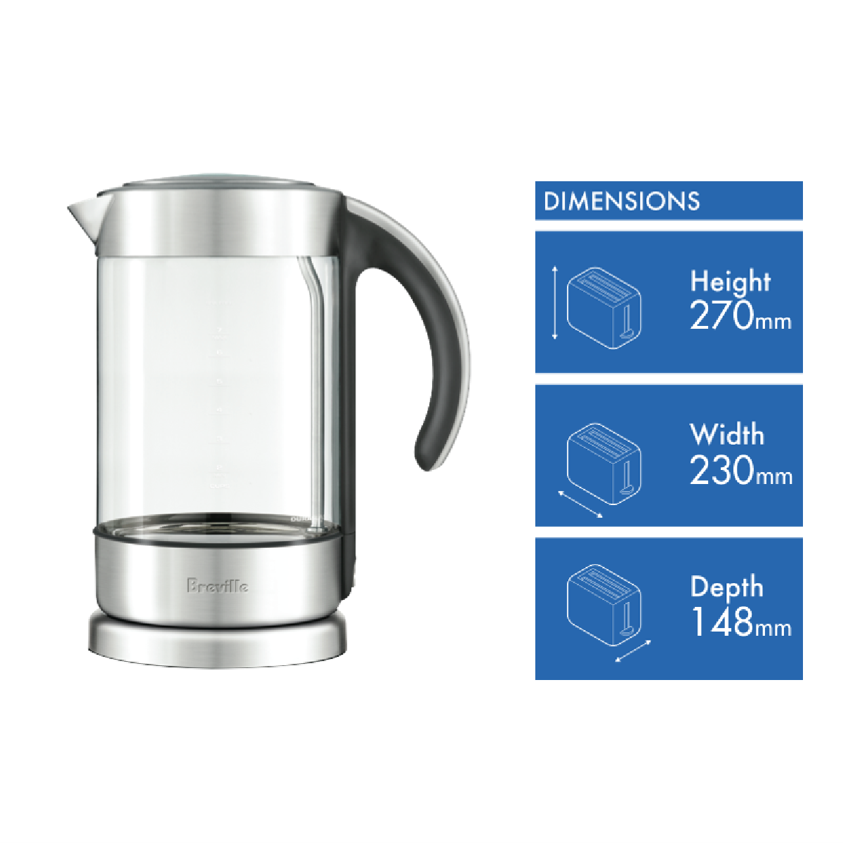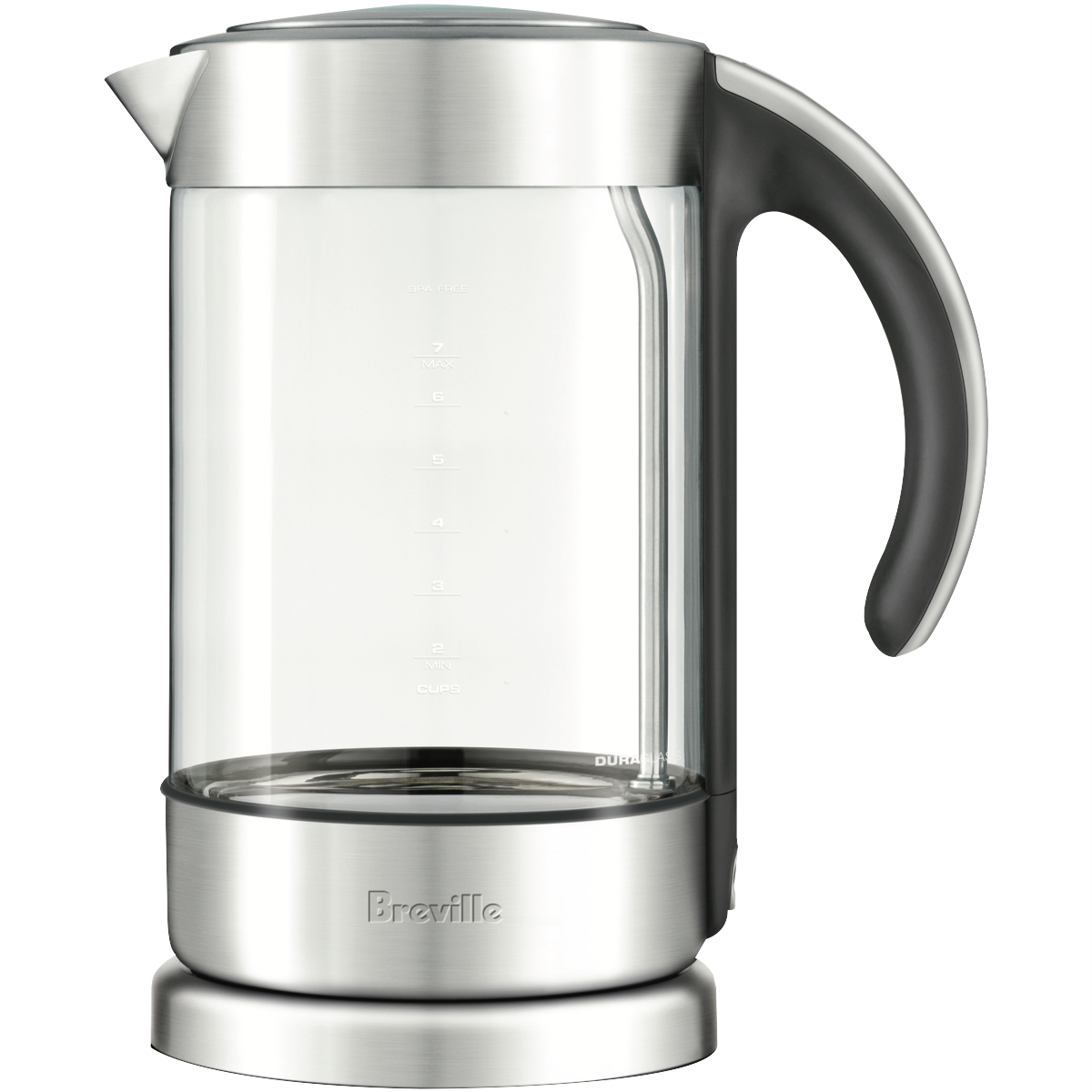With this Breville the Crystal Clear Glass Kettle BKE750CLR4JAN1 you can watch your water boil through thermal shock resistant glass. This powerful Breville kettle has a soft top lid that gently releases steam and aids to eliminate splashing. With a large 1.7L capacity you can make 7 cups of tea or coffee at once to make entertaining a breeze.