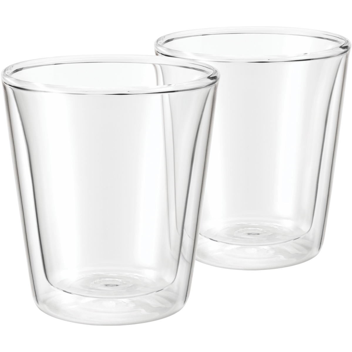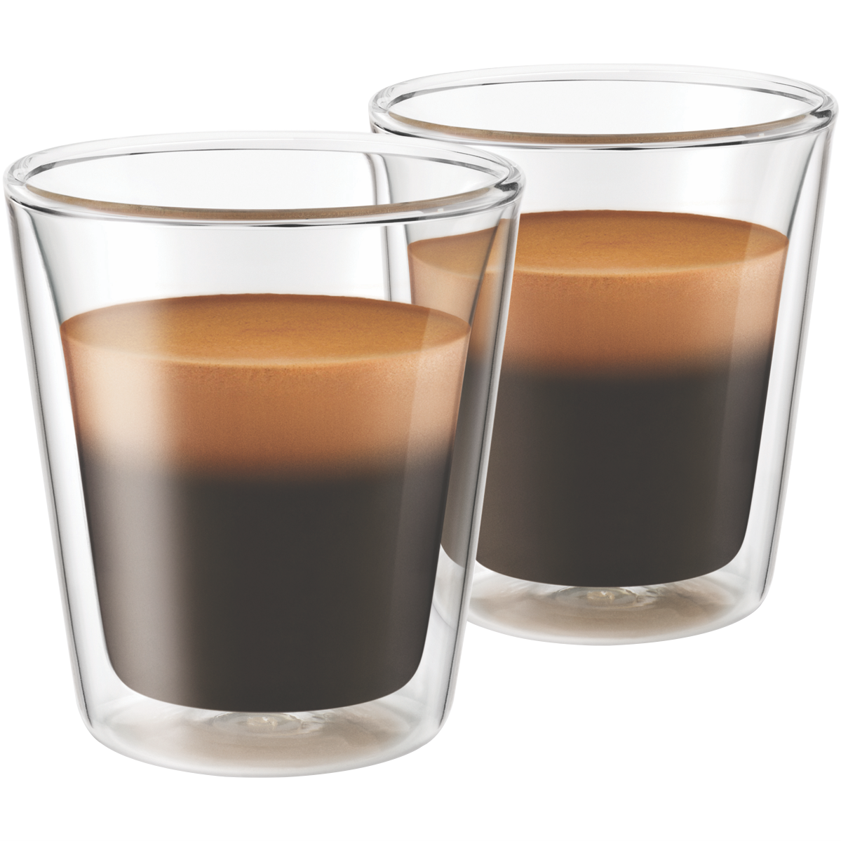 Designed to keep your espresso hot these Breville Espresso Duo Dual Wall Glasses are the perfect way to enjoy your morning coffee. Crafted from heat resistant borosilicate glass these stylish 3oz glasses feature an innovative silicone valve that equalizes air pressure while retaining heat. Enjoy your daily espresso or coffee without burning your hands thanks to the clever double wall insulation. Dishwasher microwave freezer and oven safe you can confidently use these durable glasses every day. The set of two glasses is ideal for espresso lovers who want to sip their coffee piping hot. With their modern yet simple design these glasses make a great gift for the coffee connoisseur in your life. Craft the perfect espresso experience with the Breville Espresso Duo. The manufacturer's part number for this product is BES045CLR0NAN1.