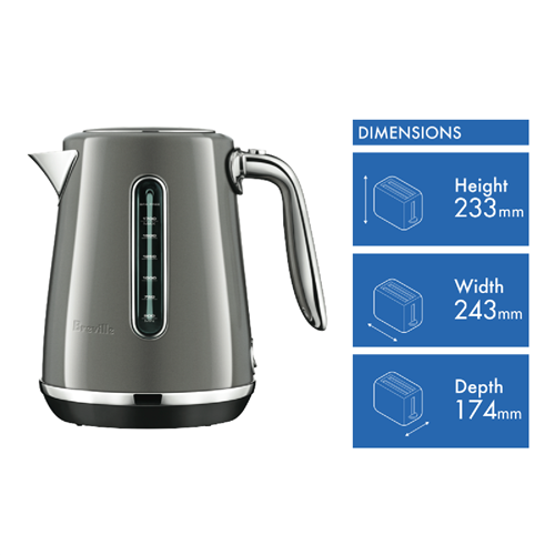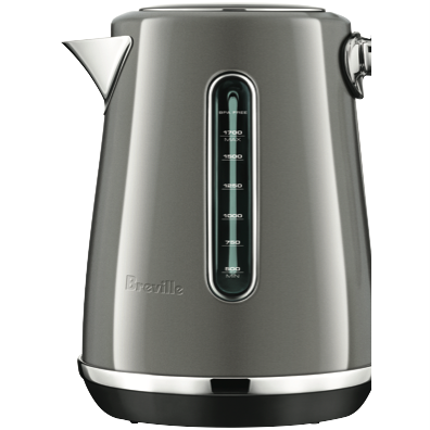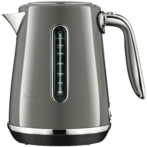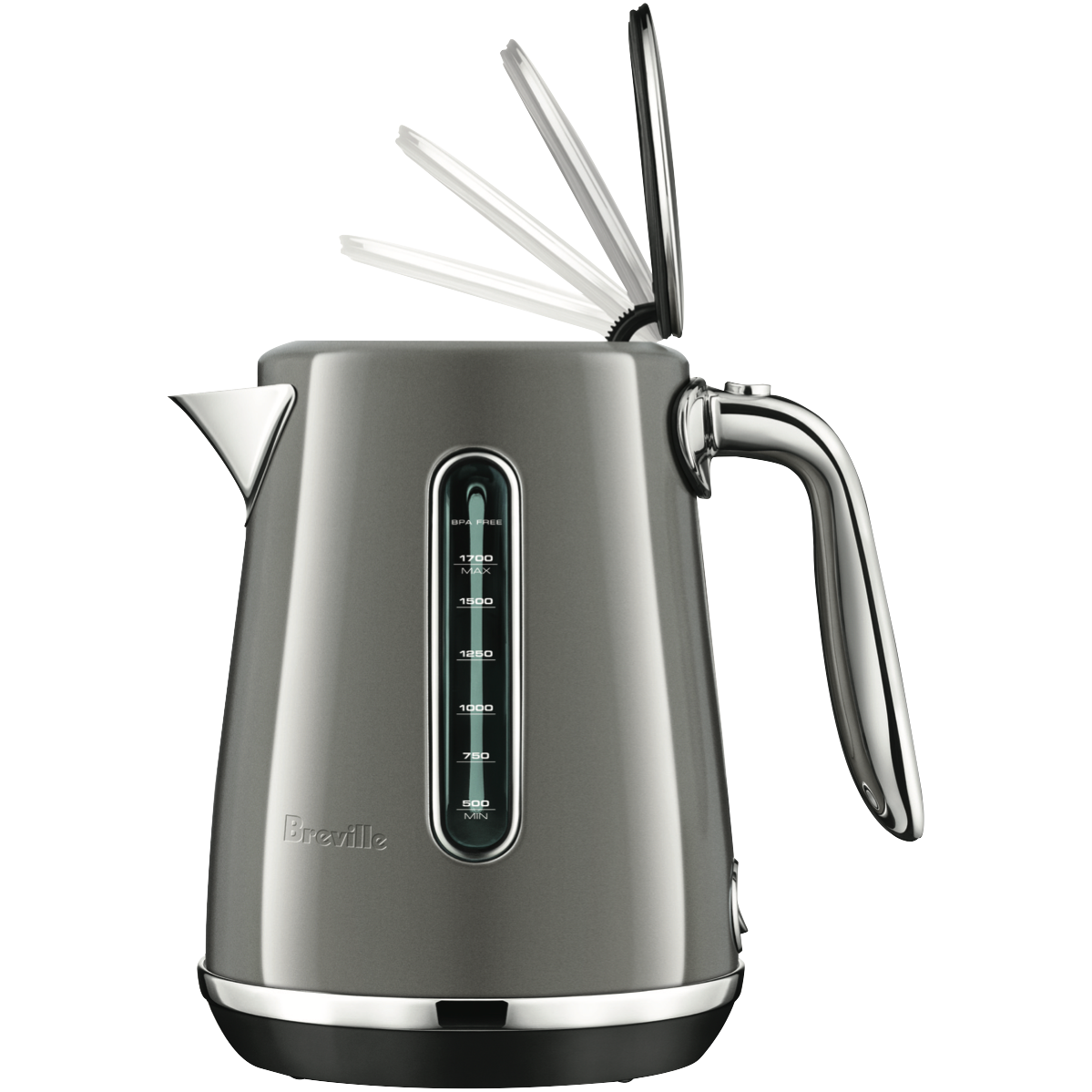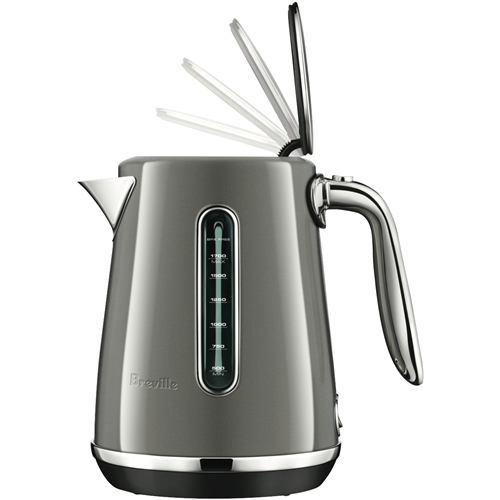 The Breville the Soft Top Luxe Kettle - Smoked Hickory BKE735SHY shines in any kitchen; the premium metallic finish with chrome accents using BPA free materials offers both amazing aesthetics and design to your kitchen. Prevent potential burns or injuries with the soft open lid which staggers hot steam and prevents hot water splash back. Be confident with your Breville the Soft Top Luxe Kettle with the safety auto shut off feature and boil dry protection. The clear view dual water windows provide the sight of exactly how much water you have left. Also the ergonomic non-slip handle prevents messes or accidental pouring to occur.