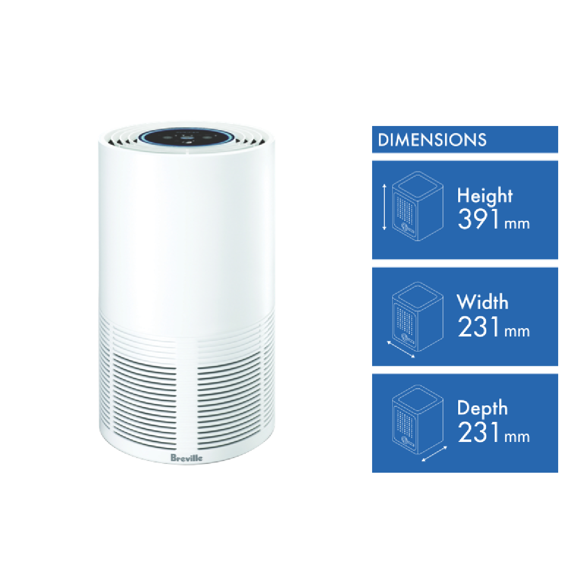 Enjoy clearer air with the Smart Air Connect Purifier LAP308WHT by Breville. Ideal for medium rooms between 30 and 40 square meters this Breville purifier keeps the air feeling clear and free of allergens thanks to a 4-stage air purification system that reduces up to 99.97% of particles. A true HEPA filter diminishes allergens and fine particles a carbon filter minimises odours and smoke a pre-filter that reduces dust and pet dander and a Microbe Shield light that targets germs bacteria and even viruses to allow for greater air purification. Check or monitor the purity levels via the SensAir live purity control and light indicator in the top of your purifier. With its immersive airflow design it purifies the air around you with a 360-degree design of the air inlet and outlet for a broader filtration. Now with Wi-Fi control via the Breville Home Connect App you can use your phone to remotely control your purifier. Plus you can enjoy cleaner air even while you sleep thanks to this air purifier's timer mode and night mode where it can be set to switch off after you're asleep.