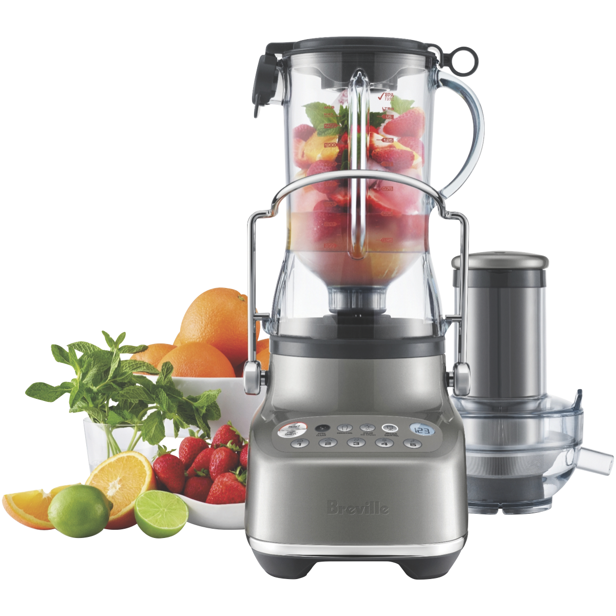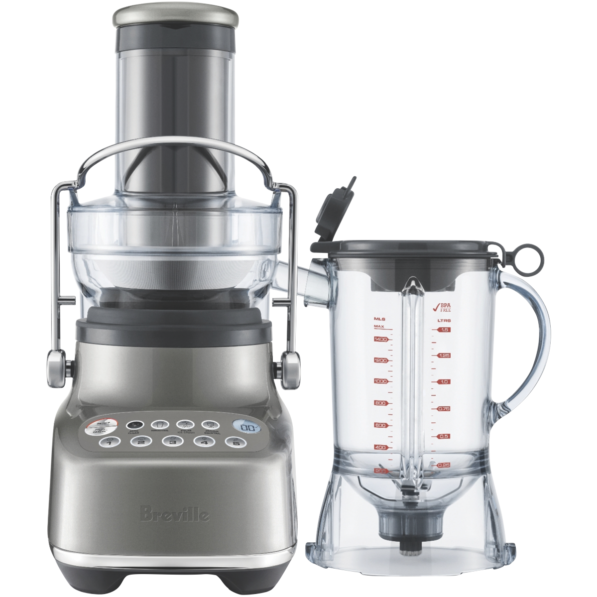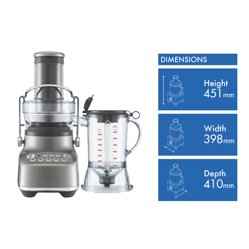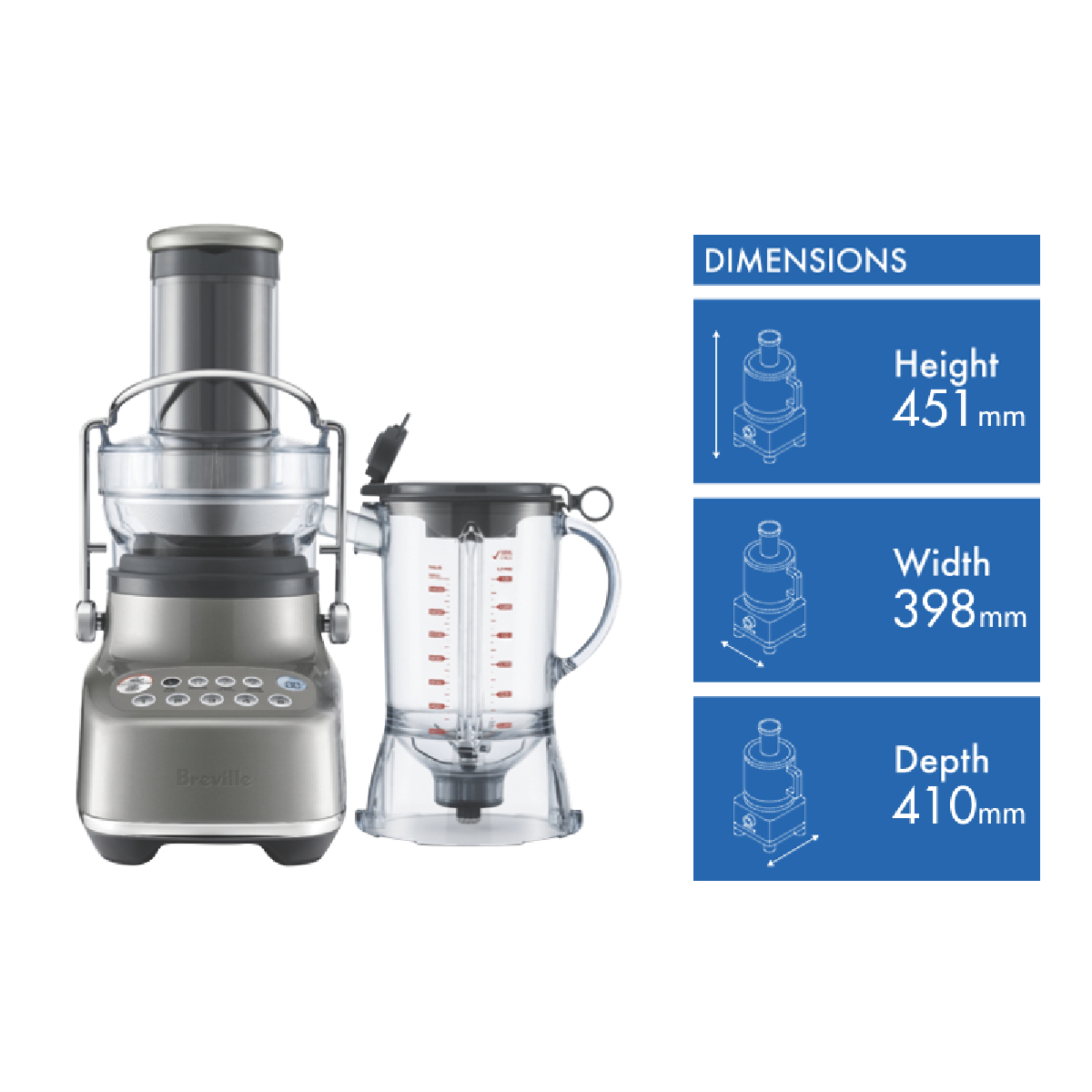 Get your daily dose of fruit and vegetables with this Breville 3 x Bluicer BJB615SHY2JAN1. The Bluicer combines a Juicer and a Blender to save space on your bench. With the Breville Kinetix bowl and blade system you get the functionality of a blender and some food processor tasks to ensure versatility and convenience. Cold Spin Technology controls temperature increases to keep your juice cool so you can enjoy refreshing juice on hot summer days. Five speed settings and four One Touch programs give you extra control over the functionality of your machine. Plus the extra-large feed chute means you can juice faster with fewer trips to the bin using the 3L large pulp bin container. With this Blucier you can get juicing blending or bluicing straight away - creating fresh juices smoothies cocktails and more!