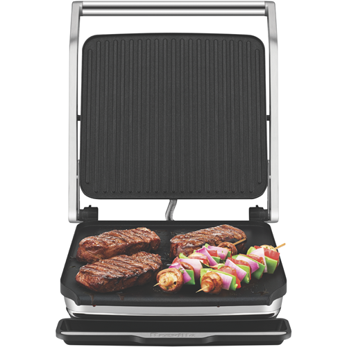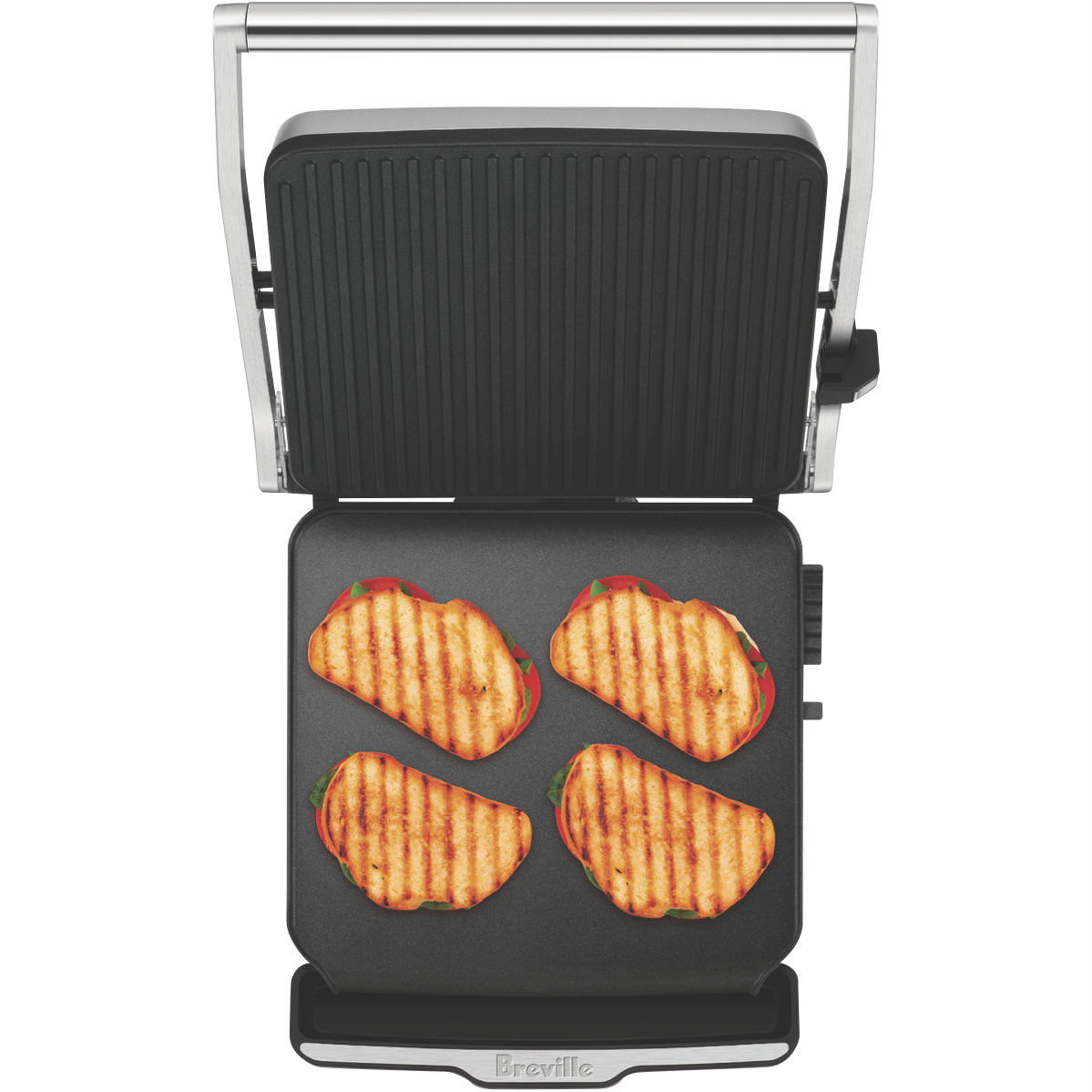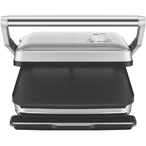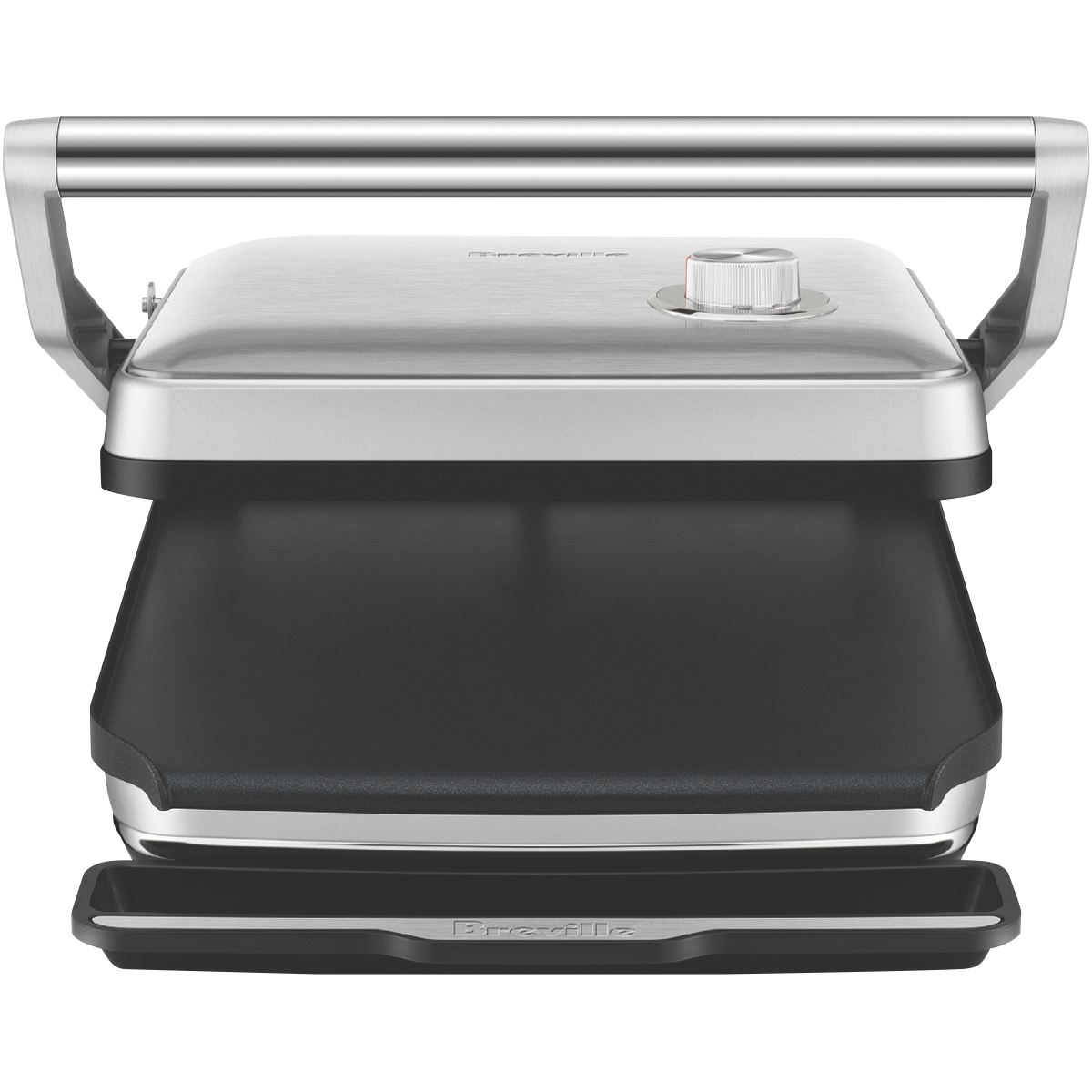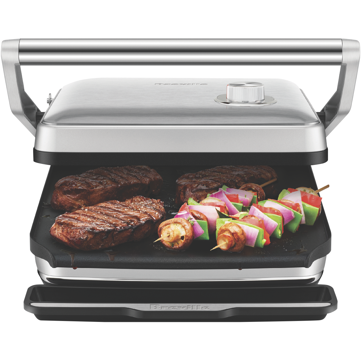 Ready to grill like a pro? The Breville AdjustaGrill and Sear (LGR350BSS2IAN1) makes it easy. With low medium high and sear settings you can cook everything just the way you like it. The flat and ribbed cooking surface lets you switch between angled and flat grilling while the floating hinged top plate adjusts to 7 settings. Cleanup is a breeze thanks to the dishwasher-safe drip tray that catches any excess grease. The heavy-duty stainless steel handles and aluminum arms are built to last. When you're done just wrap the cord around the base for tidy storage. Get grilling with Breville.