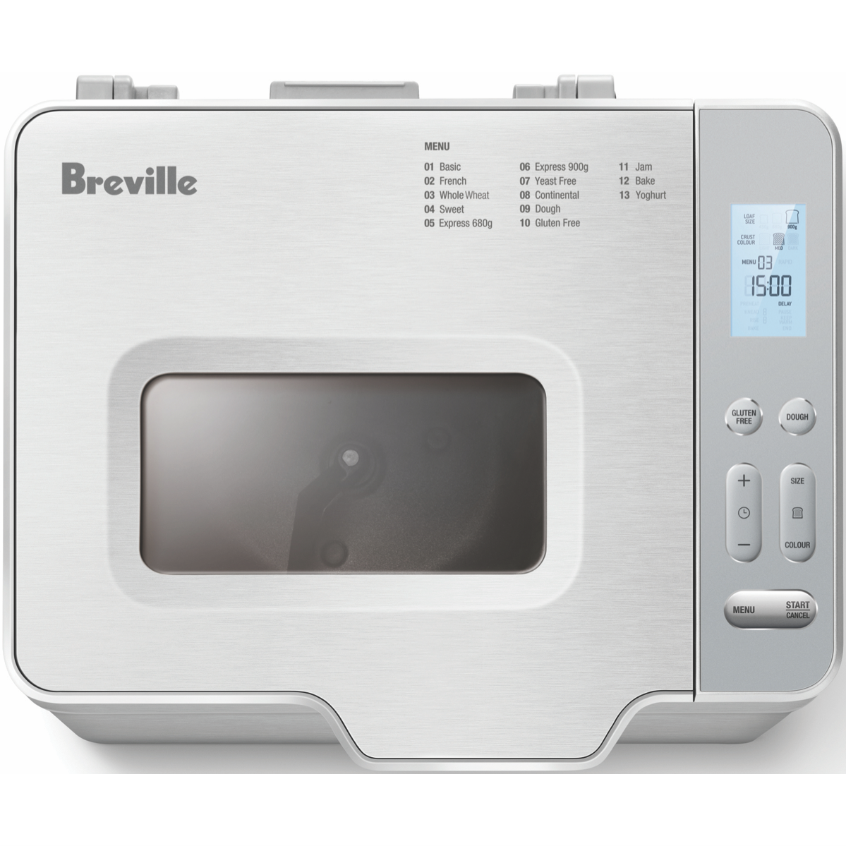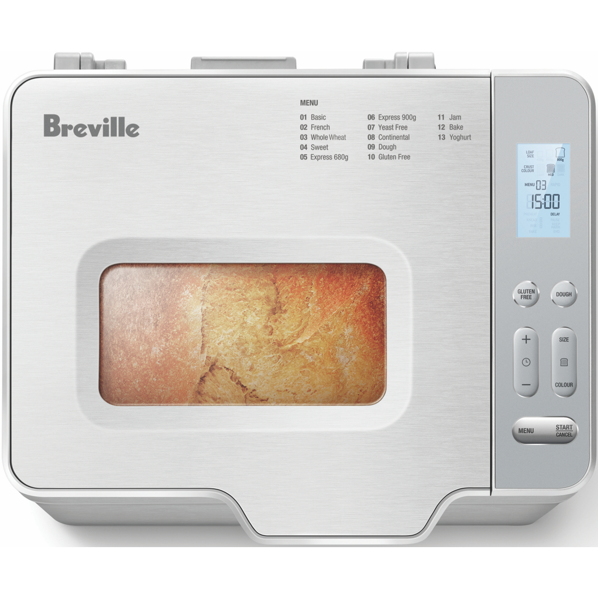 Create fluffy loaves of bread and more with the versatile Breville The Bakers Dozen. This brushed stainless steel bread maker features 13 programs to craft breads doughs and sweets with ease. Bake loaves up to 900g with settings for basic French whole wheat sweet express continental dough gluten free jam bake and yogurt breads. The automatic raisin and nut dispenser ensures even distribution of ingredients. The non-stick pan and removable kneading blade make cleanup effortless. The LCD display and 15 hour delay timer provide convenience. Keep bread warm for up to an hour after baking with the auto keep warm function. With a sleek compact design and 730 watts the Bakers Dozen simplifies baking for beginners and experts alike. Choose from light medium and dark crust settings and bake small medium or large loaves. This versatile bread machine also allows you to make pizza dough jam cakes and more. Whip up sweet and savory homemade creations for the whole family. The manufacturer's part number for this product is LBM250BSS2IAN1. Take your baking to the next level with the Breville Bakers Dozen bread maker.