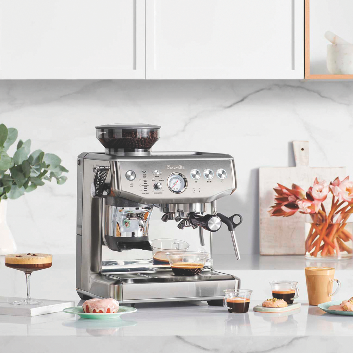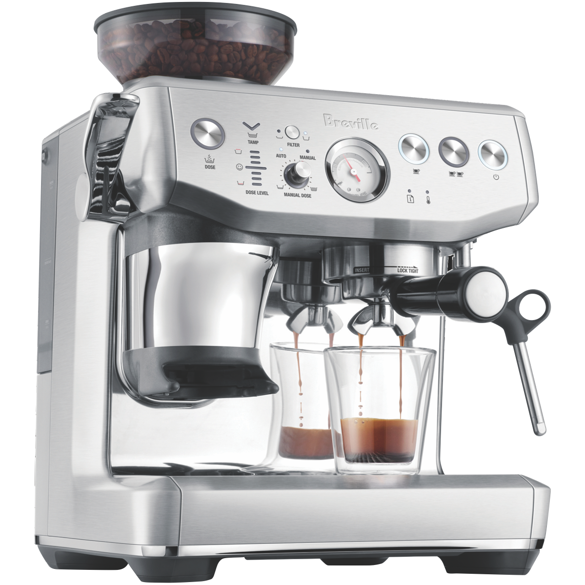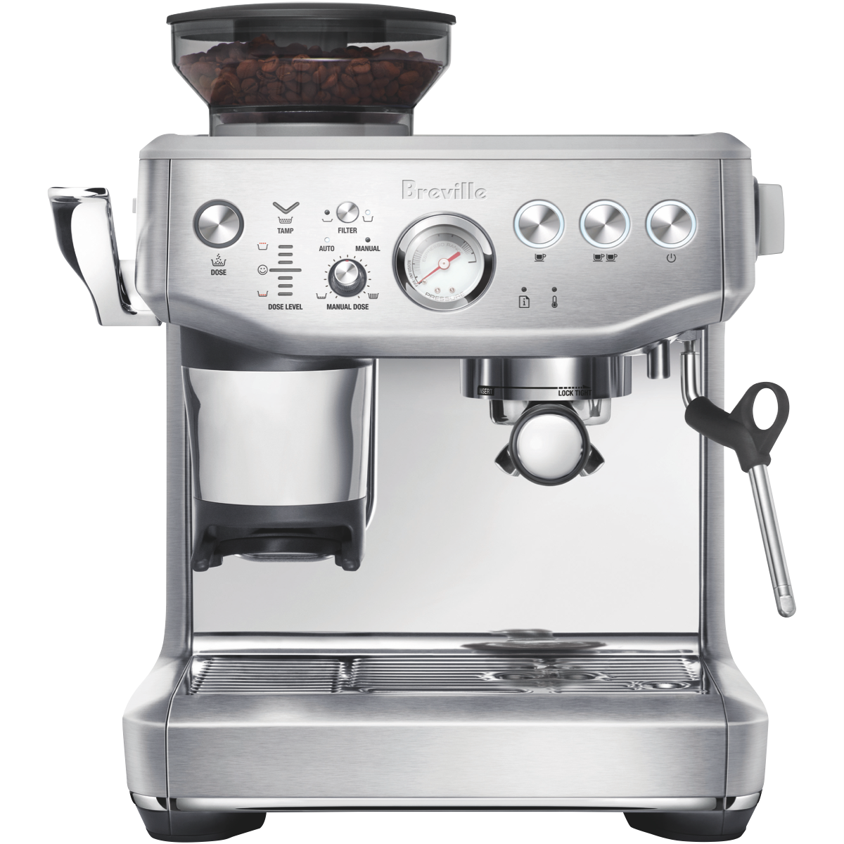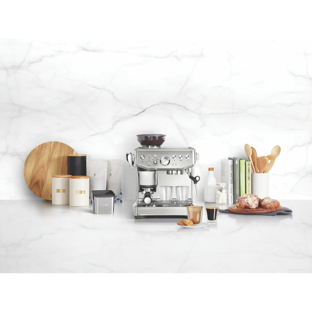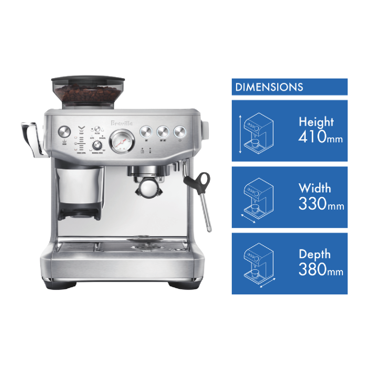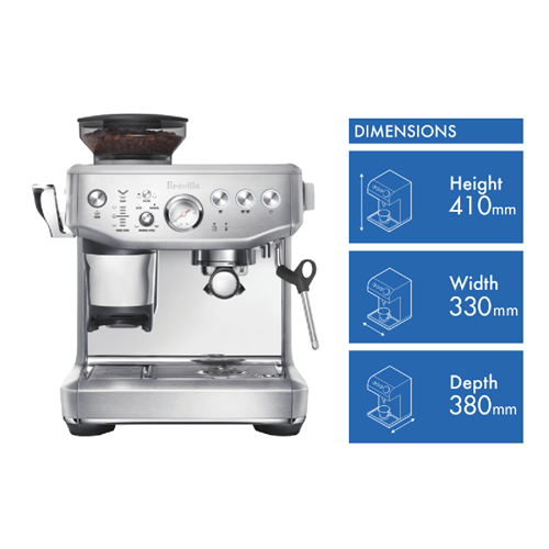 Breville's the Barista Express Impress Stainless Steel BES876BSS4IAN1 does just as its name says. Create third wave specialty coffee at home from bean to espresso in less than a minute once heated up thanks the best of the Barista Express with the Impress Puck System allowing mess free evenly packed doses measured and tamped to perfection. Achieve the perfect dose and a precise tamp while reducing the grinds on bench tops ensuring a perfect espresso latte or flat white with nine bars of pressure and 130 degrees of steam in the milk wand creating silky micro foam on top.