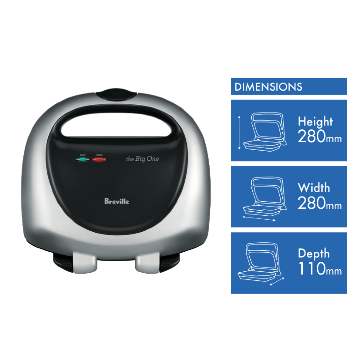 Whip up jaffles with ease with this Breville sandwich press' 2 slice capacity. It has a 1000 watt heating element. Also the Breville BTS100SIL has a non-stick coating so you can easily remove residue. Its vertical storage design helps you take advantage of upright storage. Know exactly when it's ready to use with the Breville sandwich maker's warm up and ready lights. Plus it features a black and silver finish so you can match your kitchen's colour palette. Make a variety of toasted sandwiches with help from this Breville sandwich maker.