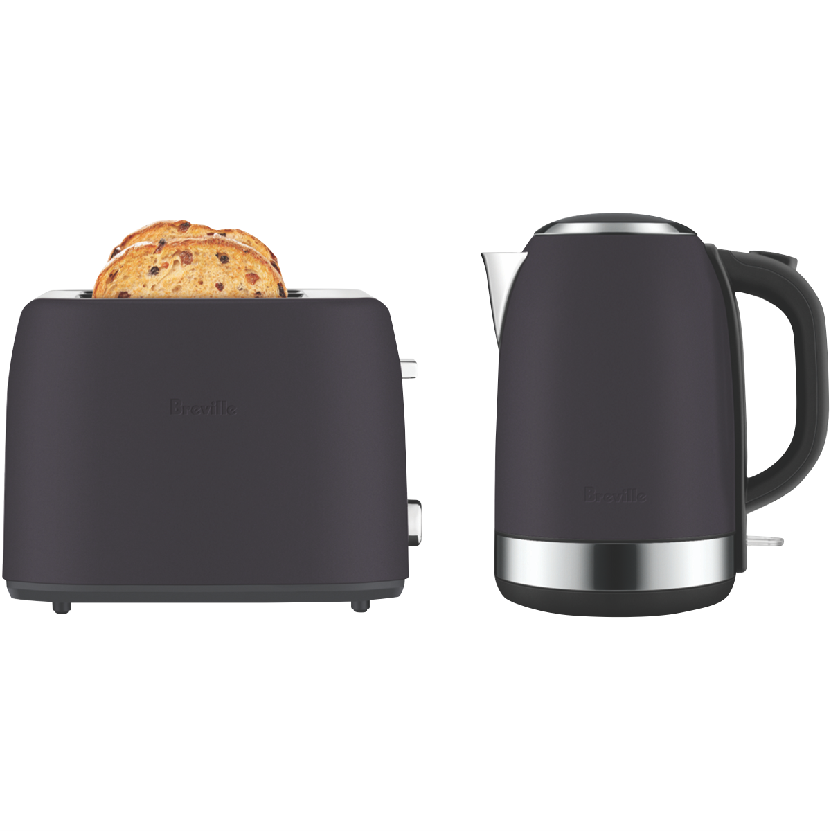 Start your mornings right with the sleek Breville The Breakfast Set. This stylish bundle pairs a high performance 2-slice toaster with a rapid boil kettle for effortless breakfast preparation. Crafted in chic midnight black stainless steel it brings sophistication to any kitchen.The 1800W toaster features extra wide slots perfect for thick artisanal breads bagels and brioche. With variable browning control you can customize results from light golden to deep crisp. The high-lift lever makes removing smaller pieces safe and easy. Other highlights include a removable crumb tray for quick cleanups cancel/reheat/defrost settings and concealed cord storage for a tidy countertop footprint. Meanwhile the 1.7L cordless kettle boils up to 5 cups of water in just minutes. The 360° rotational base provides flexibility. An auto-shutoff function prevents overheating and dry boiling. A handy water window lets you see fill levels at a glance. The washable scale filter improves flavor. This BPA-free jug is illuminated for nighttime use. An included lid release button facilitates pouring.With thoughtful touches like rapid boiling and wide slots this breakfast duo streamlines your morning routine. The manufacturer's part number for this product is LKT640MDB2IAN1. Add this sleek set to your cart to enjoy better breakfasts with less hassle.
