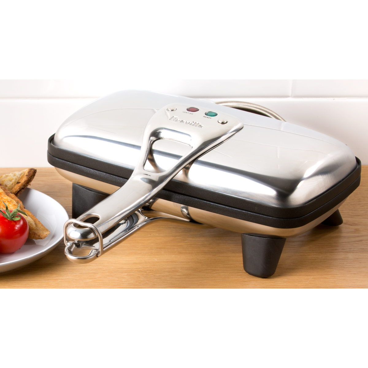 Sleek and sophisticated the Breville The Classic Sandwich Maker allows you to create delicious toasted sandwiches with ease. With 1000 watts of power this jaffle maker heats up fast so your mouthwatering sandwiches are ready in minutes. The silver finish and vertical storage capability lend a modern touch to any kitchen. Simply place your sandwich inside and close the lid to seal in flavors. The plates heat from both sides to toast your bread golden brown and melt cheese to gooey perfection. Enjoy quintessential Aussie toasted sandwiches paninis quesadillas and more. The non-stick cooking surface makes cleaning hassle-free. This 2 slice sandwich press delivers fast even results you'll love. With simple functionality sturdy build and handy storage the Breville sandwich maker streamlines sandwich making so you can create craveworthy toasted treats. Experience the joy of quick delicious homemade sandwiches with this must-have appliance. The manufacturer's part number for this product is BSG1974PSS. Check out this sandwich maker today to enjoy cafe-style sandwiches at home.