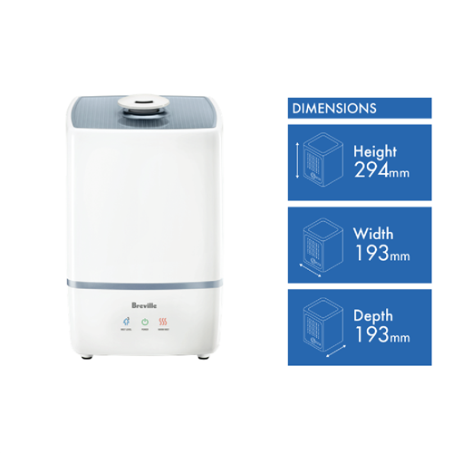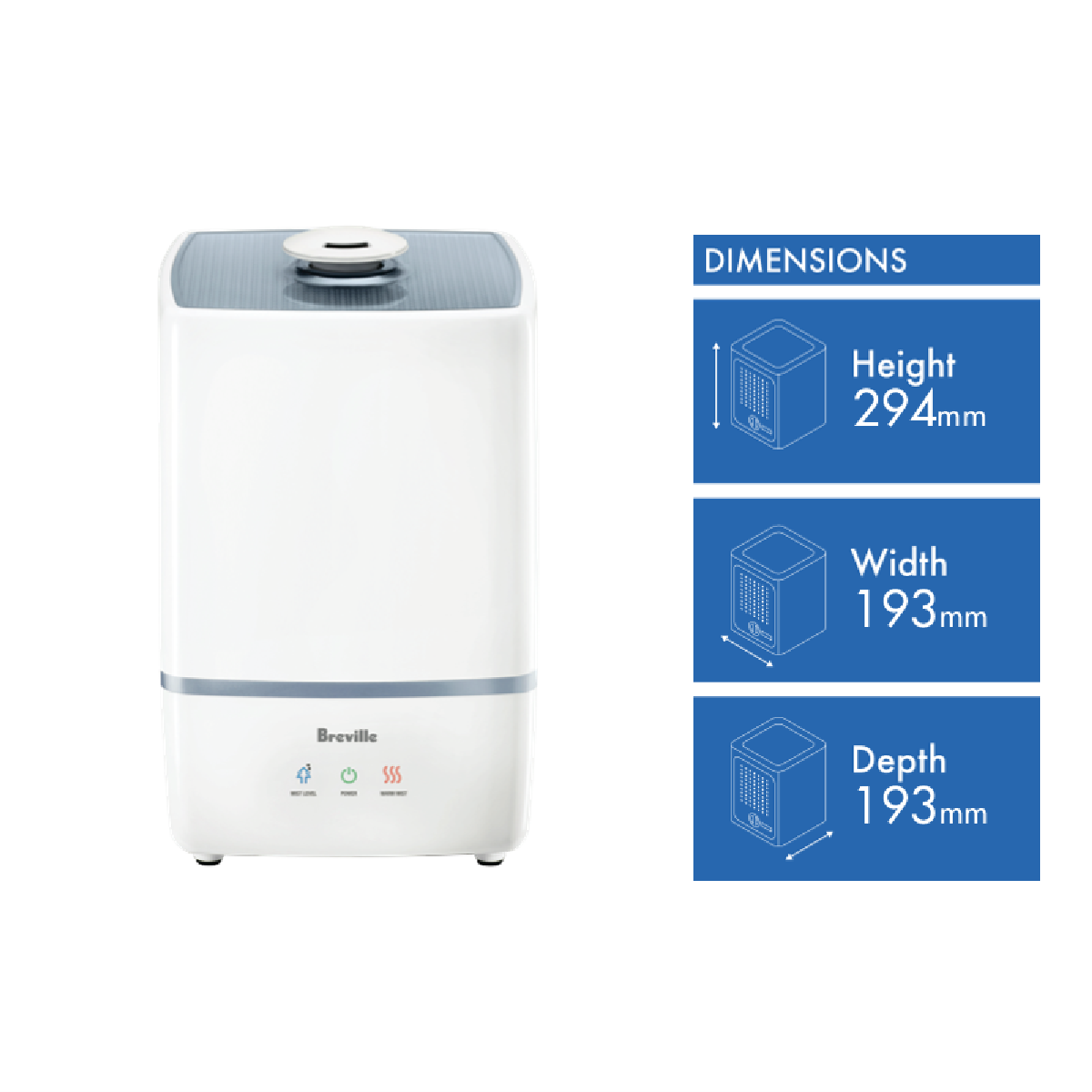 Experience the benefits of clean healthy air with the Breville The Easy Mist Humidifier. This stylish white humidifier is designed to efficiently moisturise the air in rooms up to 30m2 making it the ideal solution for your home or office. With an adjustable mist output across three levels and an evaporation rate of 260mL/h you can customise humidity based on your needs. The cool and warm mist settings allow you to create a soothing environment while the integrated aroma tray lets you add your favourite essential oils. This humidifier also utilises ultrasonic technology for near-silent operation and is easy to refill thanks to the large removable 5L water tank. Measuring 192mm wide 294mm high and 192mm deep and weighing just 1.8kg the compact Breville humidifier can sit neatly on your desk or side table. It comes with a 2 year manufacturer's warranty for added peace of mind. The manufacturer's part number for this product is LAH300WHT. Discover the difference an optimal humidity level can make - bring home the Breville The Easy Mist Humidifier today.
