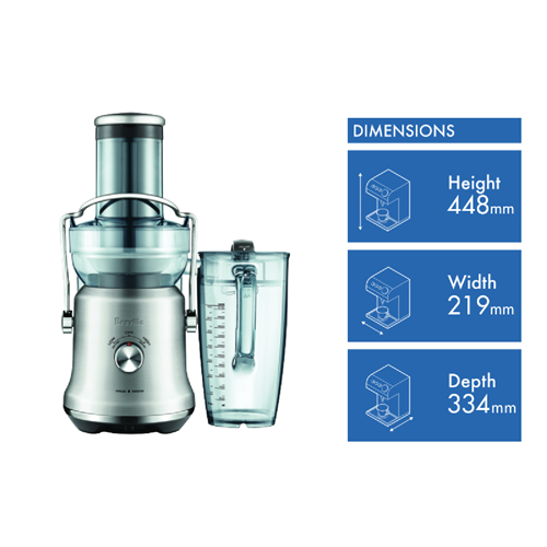 This stainless steel juice fountain from Breville is the perfect addition to your kitchen. With its titanium reinforced cutting disk and Italian micro mesh filter this juicer extracts maximum juice from whole fruits and vegetables. The extra wide 88mm feed chute allows you to juice whole produce with minimal preparation. Cold Spin Technology and space saving design provide chilled juice with less froth. With 1300 watts of power 2 speeds and 2L juice jug capacity you can create nutrient rich juices for the whole family. At 448mm high 218.5mm wide and 334mm deep this 6.2kg juicer's sleek profile fits neatly on your countertop. Enjoy delicious nutrition packed cold pressed juice for years to come. The manufacturer's part number for this product is BJE530BSS4JAN1. Check out this juice fountain to upgrade your juicing experience today.