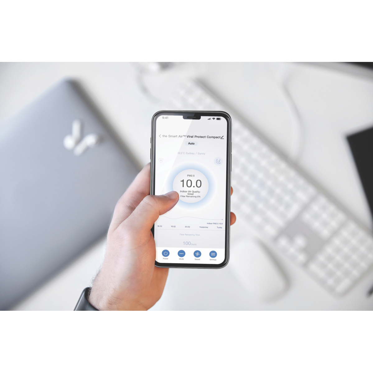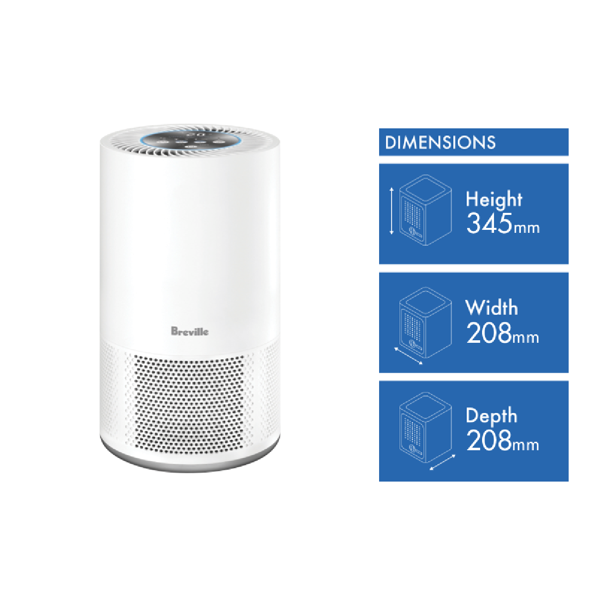 Clean fresh air in every corner of your home is simple with the Breville The Smart Air Viral Protect Compact Purifier. This sleek white air purifier features a 4-stage filtration system to capture 99.97% of allergens pollutants viruses and bacteria as small as 0.3 microns quietly circulating purified air throughout rooms up to 28m2. Connect via Wi-Fi to control settings like manual fan speeds auto mode and timer through the Breville app Amazon Alexa or Google Assistant. The auto setting intelligently monitors air quality and self-adjusts fan speed for efficient performance. With a compact portable design and easy filter replacement enjoy cleaner healthier air for the whole family. The manufacturer's part number for this product is LAP208WHT. Bring home the Breville air purifier for a fresher indoor environment.