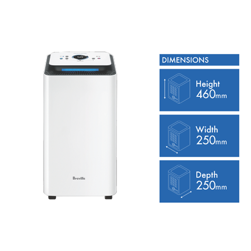 Breathe easy with Breville's smart dehumidifier. This compact unit draws excess moisture from the air in spaces up to 30 square meters ideal for bedrooms living rooms and studies. With an efficient 2.5 liter tank capacity and automatic shut off when full the Breville dehumidifier protects your home from dampness and musty odors. Standing just 460mm tall 250mm wide and 250mm deep its sleek profile blends into any home decor seamlessly. Weighing only 9.5kg you can easily move it between rooms as needed. The manufacturer's part number for this product is LAD208WHT. Control moisture and mold in your home with this user-friendly dehumidifier.