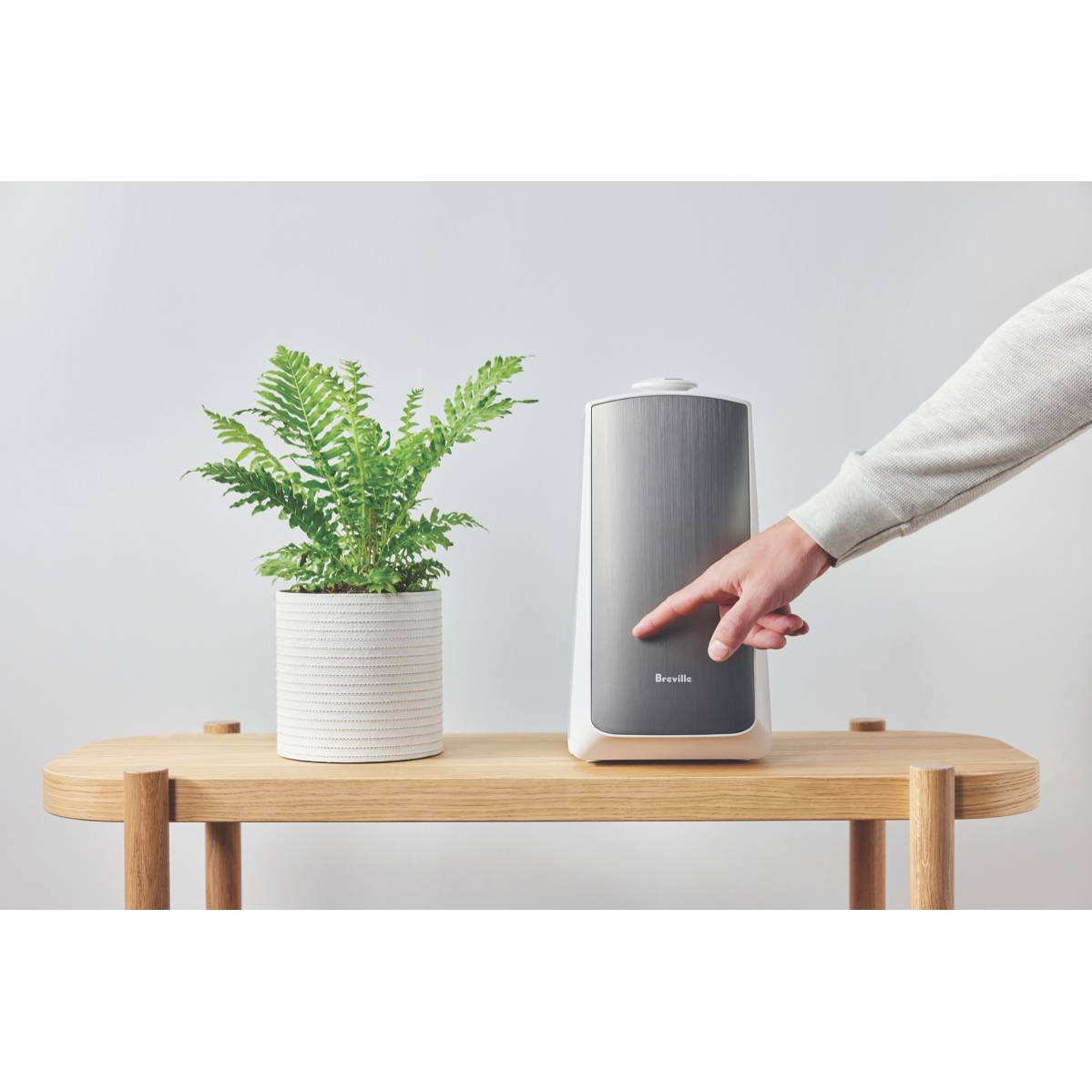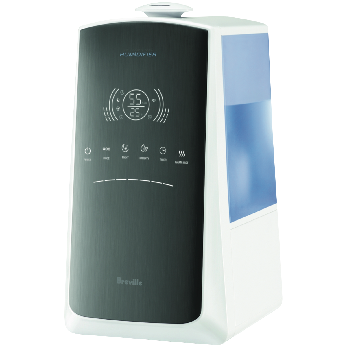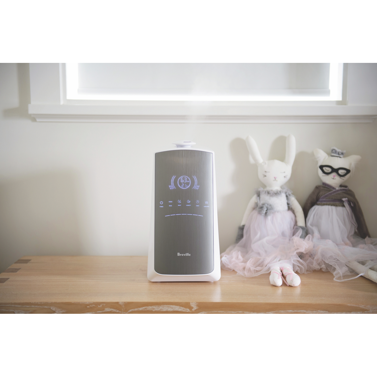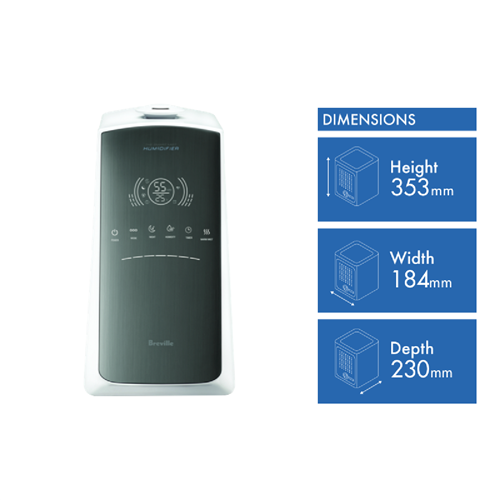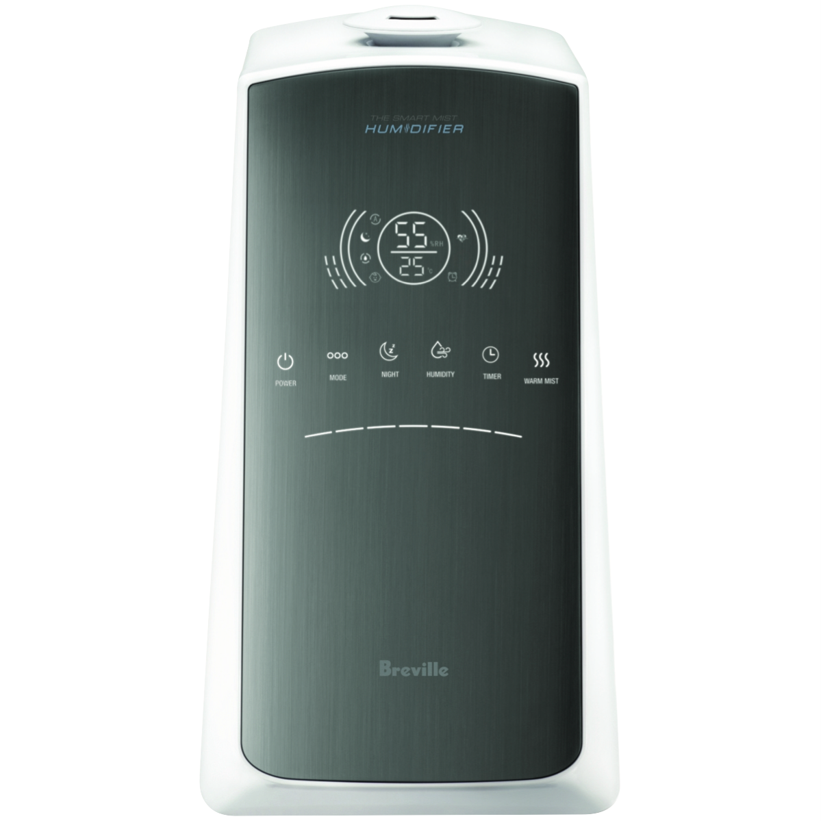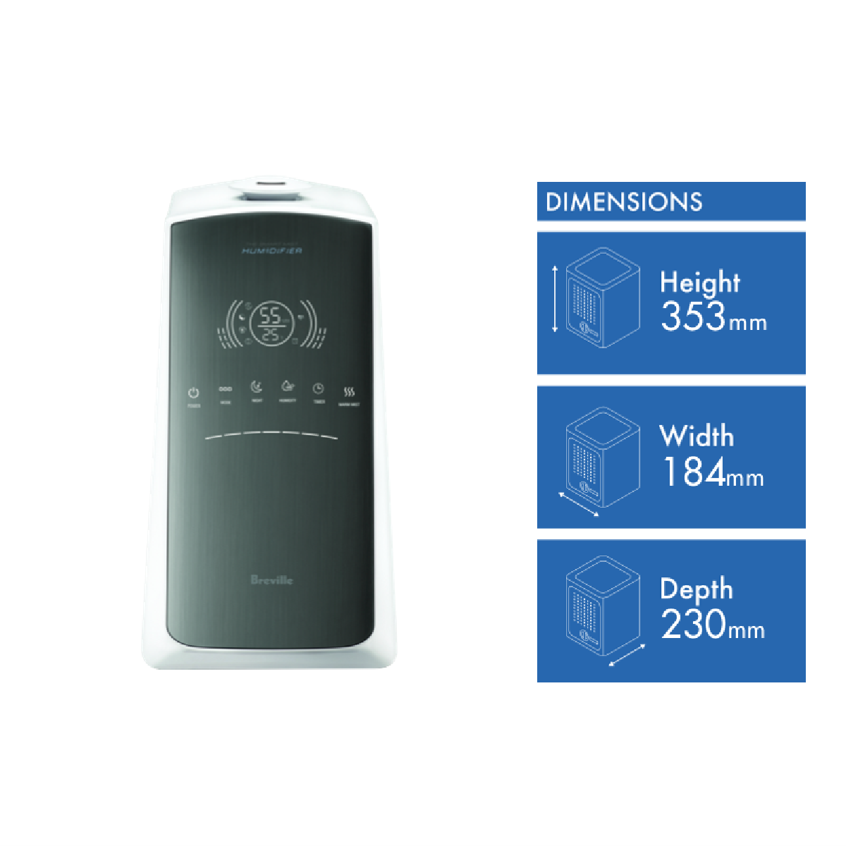 Escape the dry air and breathe easy with the Breville The Smart Mist Humidifier. This sleek and stylish humidifier in crisp white adds moisture to the air for healthier breathing and clearer sinuses. The large 5L tank provides ample moisture for rooms between 20-40m2 while the integrated water purifier eliminates impurities for cleaner mist. With 7 mist levels and modes like Baby Mode for gentle humidity and Allergen Mode to reduce airborne allergens you can customize comfort in any room. The unique Sensair sensor automatically adjusts output for ideal humidity. Cool and warm mist options allow you to tailor the moisture just right. At 353mm tall 230mm wide and just 2.36kg the compact humidifier fits neatly into small spaces. The Breville humidifier runs quietly at less than 38dB for uninterrupted sleep and includes a handy remote control. Reduce dry air irritation with the 2 year warranty-backed Breville The Smart Mist Humidifier. The manufacturer's part number for this product is LAH400WHT. Discover the difference optimized moisture can make in your home with this intelligent humidifier.