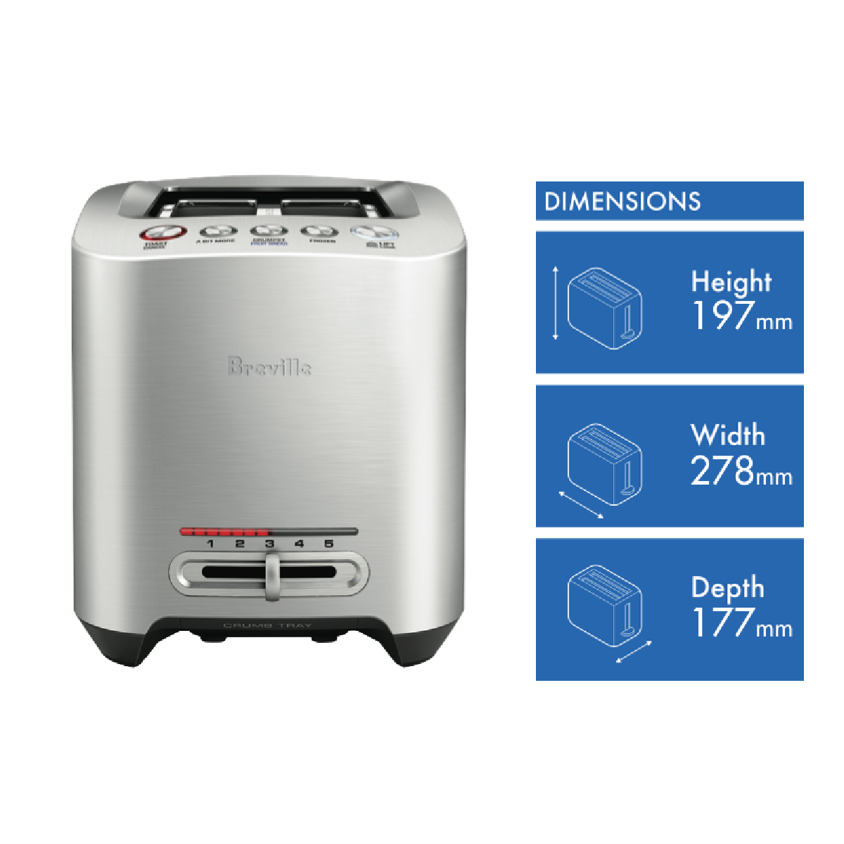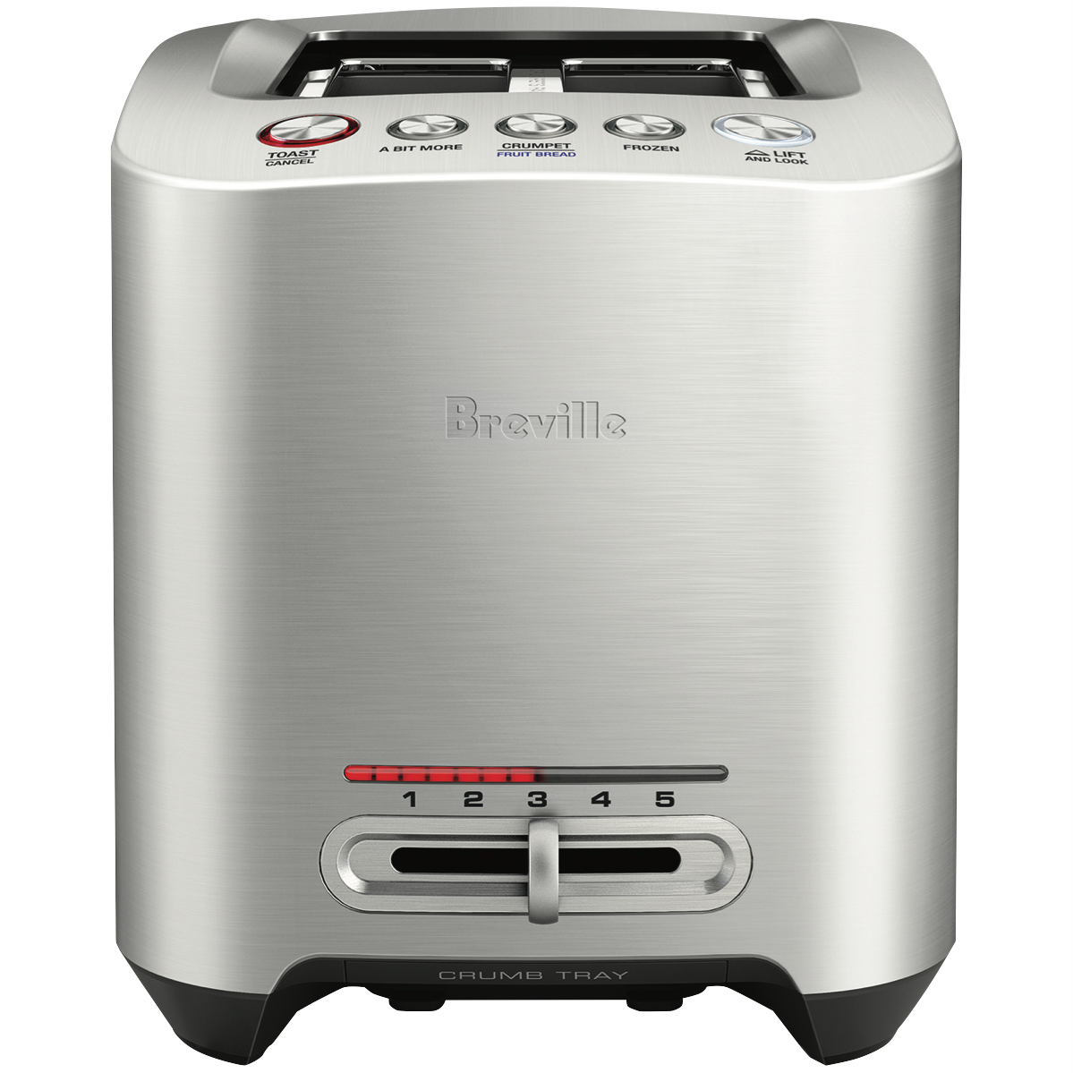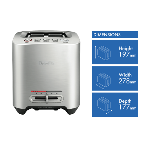 Start your mornings right with the Breville The Smart Toast 2 Slice toaster. Crafted in stainless steel this sleek 2-slice toaster delivers perfectly toasted bread and bagels with smart features like a Bit More button for extra browning and dedicated settings for fruit bread crumpets and frozen items. With a high 1000W power output and variable browning control you can achieve your ideal toast shade every time. The motorised lift and look feature automatically raises and lowers the bread carriage for easy monitoring without interrupting the toasting cycle. Other convenient highlights include a removable crumb tray for quick cleanups cord storage to minimise clutter and an LED ready indicator when your toast is ready. Backlit buttons provide easy selection in low light conditions. With a solid die-cast metal body promising durability and a 2 year manufacturer's warranty for peace of mind the Breville The Smart Toast 2 Slice toaster will be your new go-to appliance for delicious golden brown toast and bagels every morning. The manufacturer's part number for this product is BTA825BSS. Take your breakfast toast to the next level with the Breville The Smart Toast 2 Slice toaster.