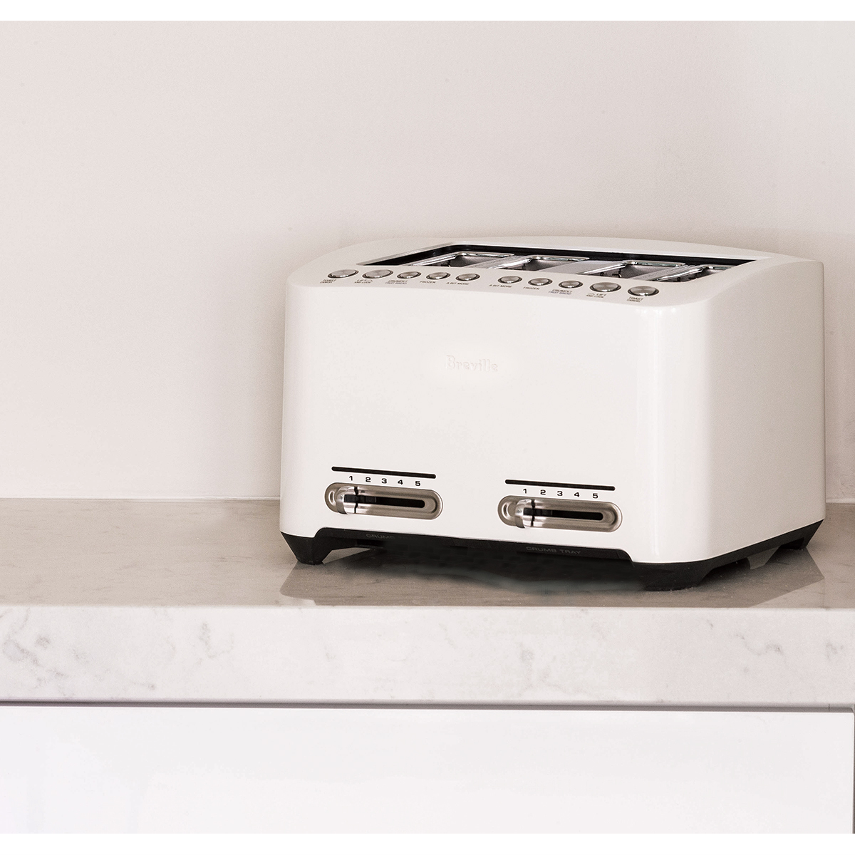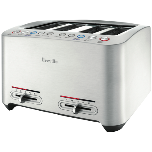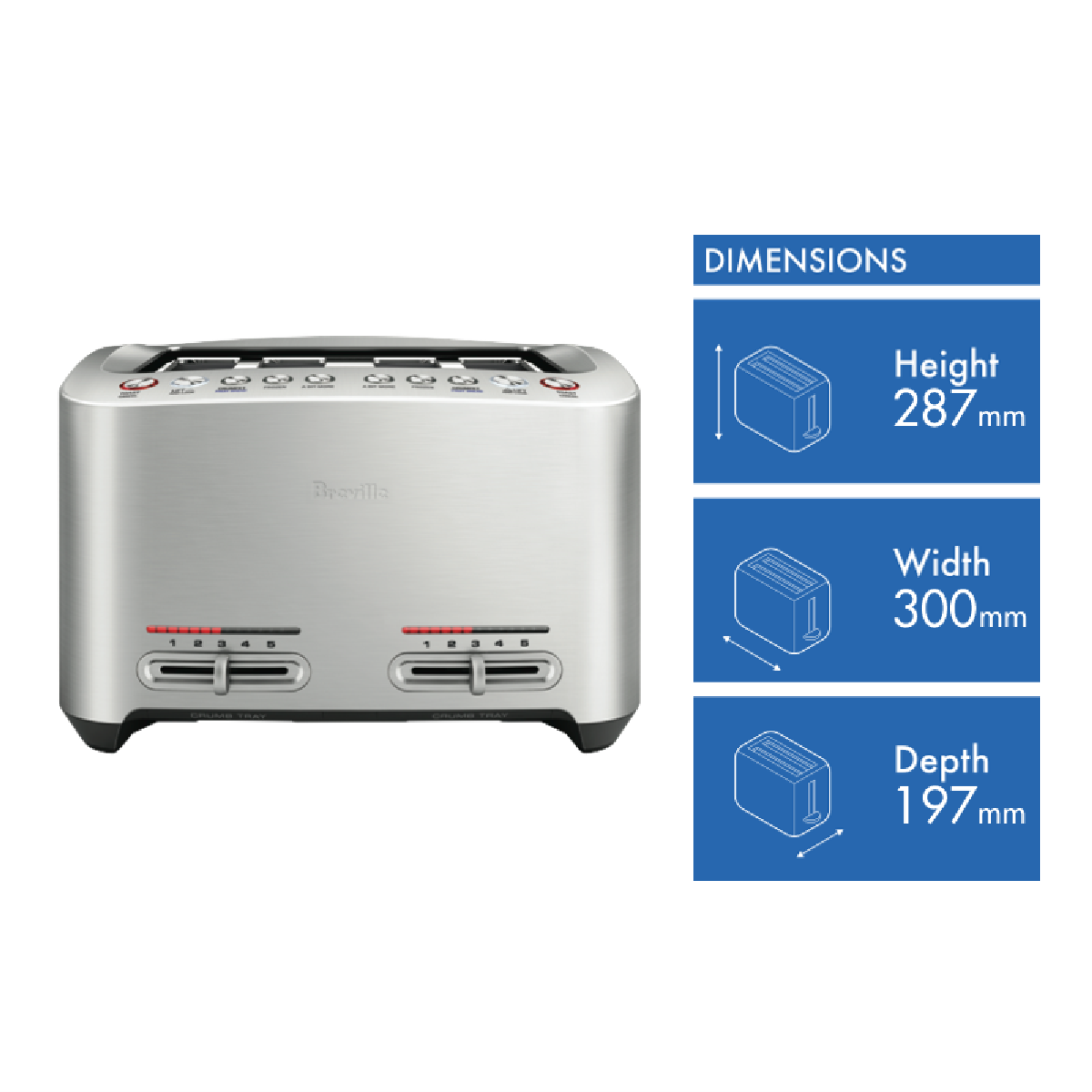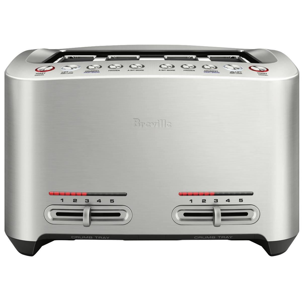 Start your mornings right with the Breville The Smart Toast 4 Slice toaster. Its sleek stainless steel design and solid one piece diecast metal body add style and durability to any kitchen. With 2000 watts of power it can toast up to 4 slices of bread at a time. The variable browning control and A Bit More button let you customize toasting for any taste. Special modes for fruit bread crumpets and bagels ensure optimized results. The motorized carriage lowers bread with a simple one-touch operation. The motorized lift allows you to check progress without interrupting the cycle. With thoughtful design features like a removable crumb tray cord storage and an LED progress indicator this toaster makes breakfast easy. The Breville toaster includes independent controls so you can toast two different items to perfection at the same time. An alert sounds when toast is ready so you'll never burn breakfast again. With a 2 year manufacturer's warranty the Breville The Smart Toast 4 Slice toaster will be your go-to appliance for delicious toast for years to come. The manufacturer's part number for this product is BTA845BSS. Bring home the Breville The Smart Toast 4 Slice toaster for effortless breakfasts.