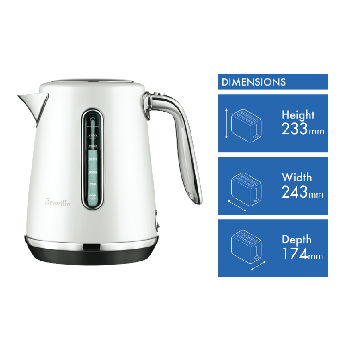 Now available in a stunning sea salt matte white version this Breville Soft Top Luxe kettle is constructed from brushed stainless steel with premium metallic finishes and chrome detailing to bring a whole new level of style and sophistication to the humble kitchen kettle. This cordless electric Breville kettle has a 1.7 litre capacity for boiling up to 7 cups of coffee or tea in no time with its 2400 watts of power that ensures a speedy boil. Plus it's soft-open lid is careful to slowly release steam to prevent hot water splash back. The Breville BKE735SST4JAN1 has a cushioned controlled lid dual water windows that are BPA free an ergonomically designed stainless steel handle an illuminated power switch and sits on a 360-degree multi-directional base with a cord storage wrap to eliminate kitchen clutter. This Breville sea salt matte white Soft Top Luxe kettle is designed to match the rest of the sea salt white matte Luxe range including the Breville Luxe 2 Slice Toaster BTA735SST4JAN1 and Breville Bambino Espresso Machine BES500SST4JAN1.