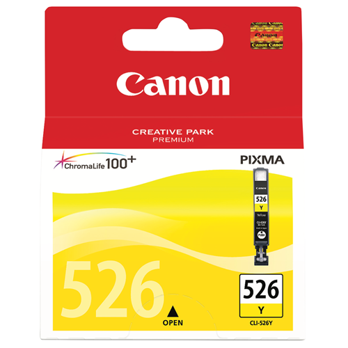 Replenish your printing with this Canon CLI526 Yellow Ink Cartridge. This cartridge offers vivid yellow tones to bring your documents and photos to life with 450 pages of vibrant colour. Specially designed for Canon Pixma printers like the MG5150 MG5250 MG6150 and MG8150 this cartridge slots right into your machine for easy and mess-free replacement. The CLI526Y produces sharp text and minimises smudging so you can print lab quality documents at home. With Canon's FINE print head technology you'll get excellent results whether you are printing photos charts letters or reports. For bright accurate yellows every time you print choose the Canon CLI526Y Ink Cartridge. The manufacturer's part number for this product is CLI526Y. Bring your printing to life with this easy to install yellow cartridge.