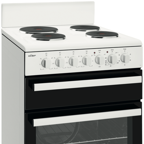 This Chef upright cooker features an electric powered oven. Its 4 burners help you cook multiple dishes simultaneously. Plus the Chef CFE535WB has a 540mm width a 910mm height and a 635mm depth. It has a white finish and a 79 litre capacity. You can establish the focal point of your kitchen thanks to this Chef upright cooker.