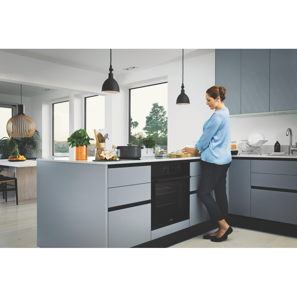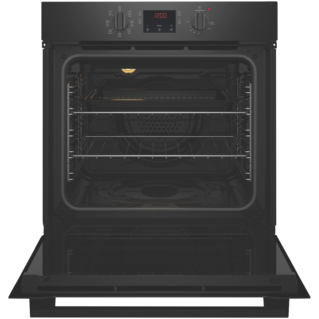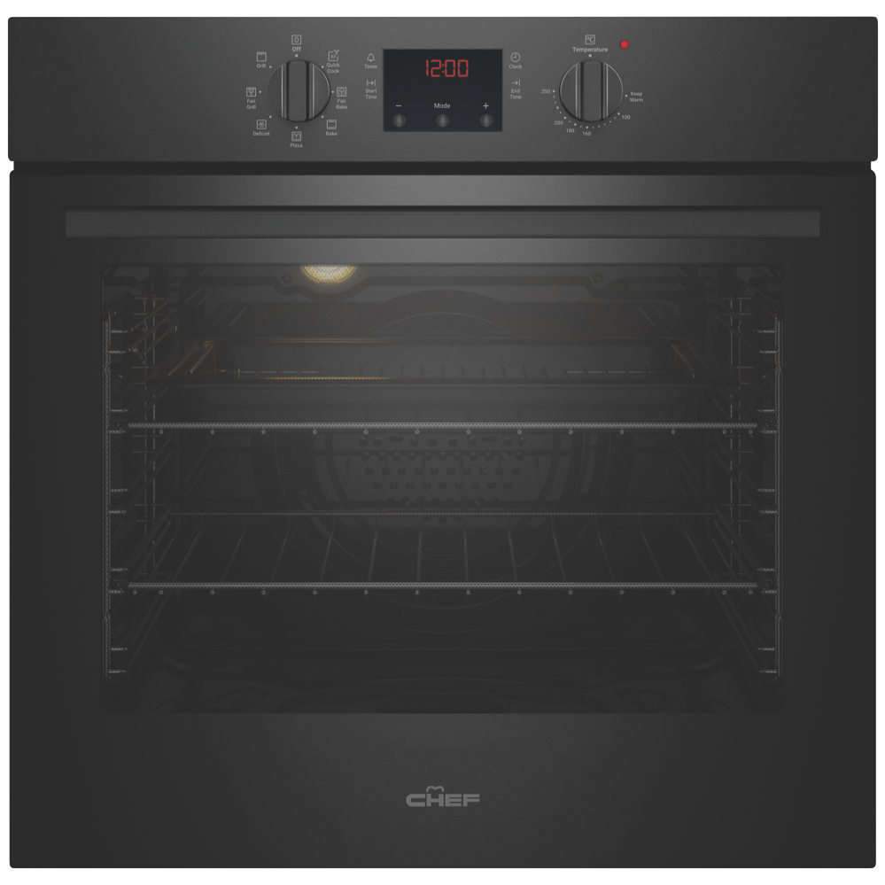 Get dinner on the table sooner with the easy-to-use Chef 60cm Electric Oven Black CVE614DB making cooking fuss-free and uncomplicated while keeping your kitchen stylishly on trend with its pure matte black finish and dark glass door. Cooking flexibility is yours with a 72-litre gross capacity oven cavity and seven functions including 'Fan Bake' for cooking meals on multiple levels or 'Quick Cook' for rapid and even heat for speedy roast dinners or for cooking pre-cooked foods straight from the freezer - think meat pies or savoury pastries when there's no time to meal prep. Conveniently thaw out frozen foods using the low temperature setting of the Defrost function. Starting the oven is simple with just two control knobs to operate: select a cooking function at the left oven function selector followed by the temperature at the far-right oven thermostat control. Operate the middle timer to set the cooking start time and duration when precision matters. Featuring removable inner glass panes for thorough cleaning and a cool door to minimise the heat on the outside this user-friendly Chef oven makes your time in the kitchen simple and enjoyable.