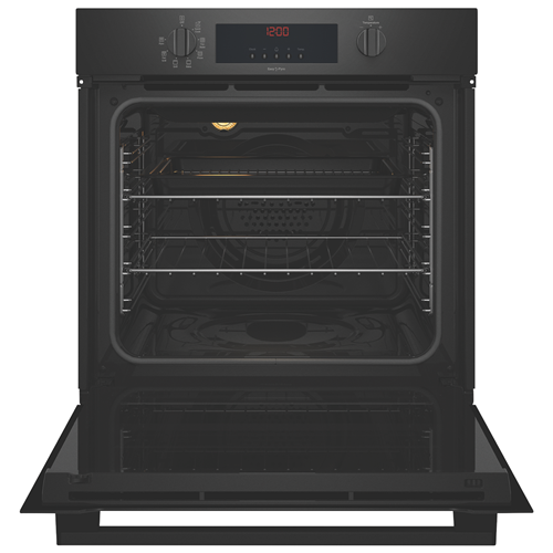 The Chef 60cm Pyrolytic Oven Black CVEP614DB makes both cooking and cleaning quick and easy while keeping your kitchen stylishly on trend with its pure matte black finish and dark glass door. Pyrolytic technology makes this a self-cleaning oven - simply turn the dial to 'Pyro' and the oven reaches high temperatures to turn residue into ash for a quick wipe once the cavity has cooled down. Cooking flexibility is yours with a 72-litre gross capacity oven and seven functions including 'Fan Bake' for cooking meals on multiple levels or 'Quick Cook' for rapid and even heat for speedy roast dinners or for cooking pre-cooked foods straight from the freezer - think meat pies or savoury pastries when there's no time to meal prep. Starting the oven is simple with just two control knobs to operate: select a cooking function at the left oven function selector followed by the temperature at the far-right oven thermostat control. Operate the middle timer to set the cooking start time and duration when precision matters. Get dinner on the table fast and perfect a thorough clean without fuss thanks to the Chef pyrolytic oven making your time in the kitchen simple and enjoyable.