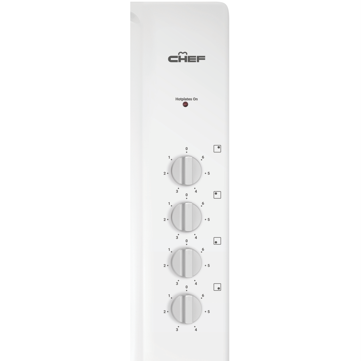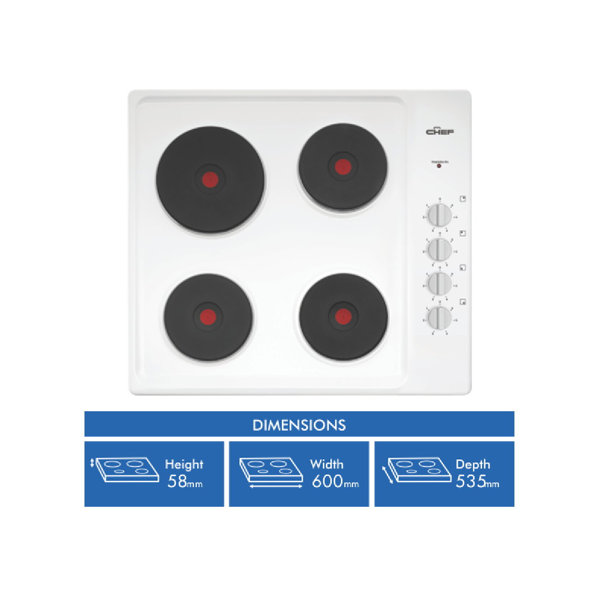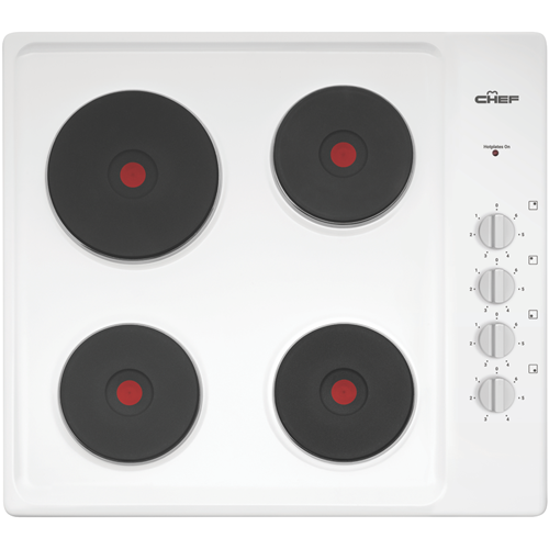 Create meals with variety using the Chef 60cm Electric Cooktop White CHS642WB and its four cooking zones. Controls are positioned to the side for safety whilst offering quick and easy changes to the heat intensity at any given time. Heating lamp indicators make it clear which zone is in operation while the easy-to-clean white enamel finish and corrosion resistant solid hotplates offer easy upkeep and durability. Make delicious food without fuss with this Chef cooktop.