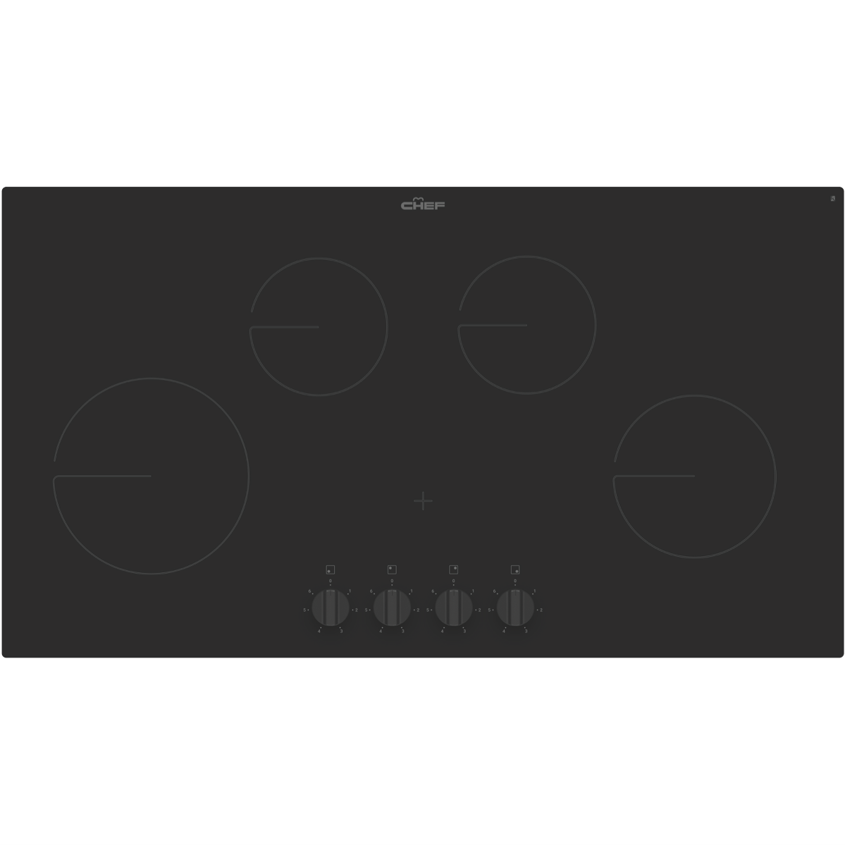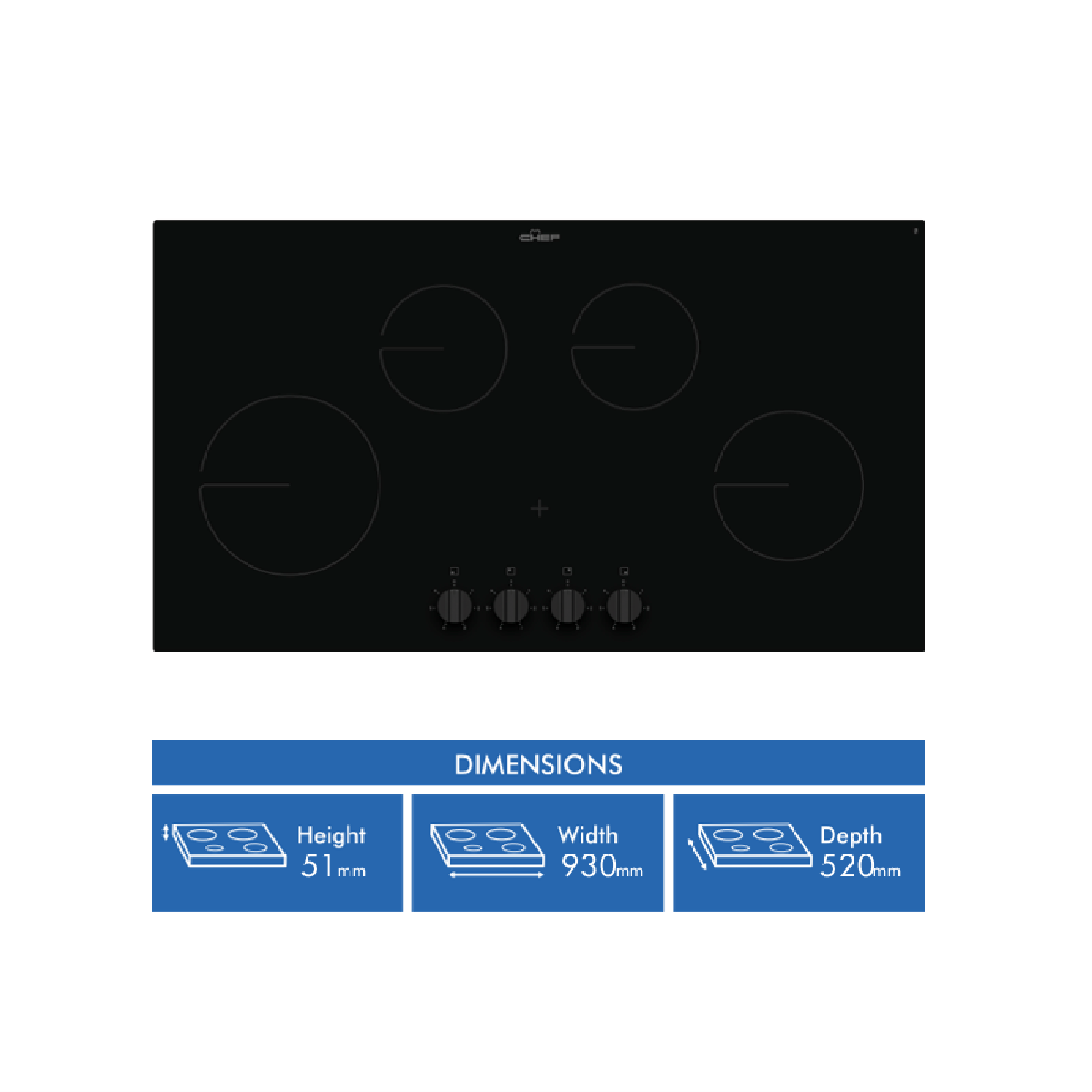 The layout and timeless design of this Chef 90cm Ceramic Cooktop CHC942BB offers maximum cooking freedom and keeps your kitchen on trend with its black ceramic glass surface and black controls. Be free of limitations with four cooking zones spaced out in such a way to allow for cookware of various sizes as you whip up sizzling stir-fry creations on the large zone as accompanying dishes simmer or boil to the side. Hot surface indicators let you know when the surface is still too hot to touch after cooking. Cleaning this Chef cooktop is a breeze thanks to the smooth glass surface that can be simply wiped down with a damp cloth when it's safe to do so.