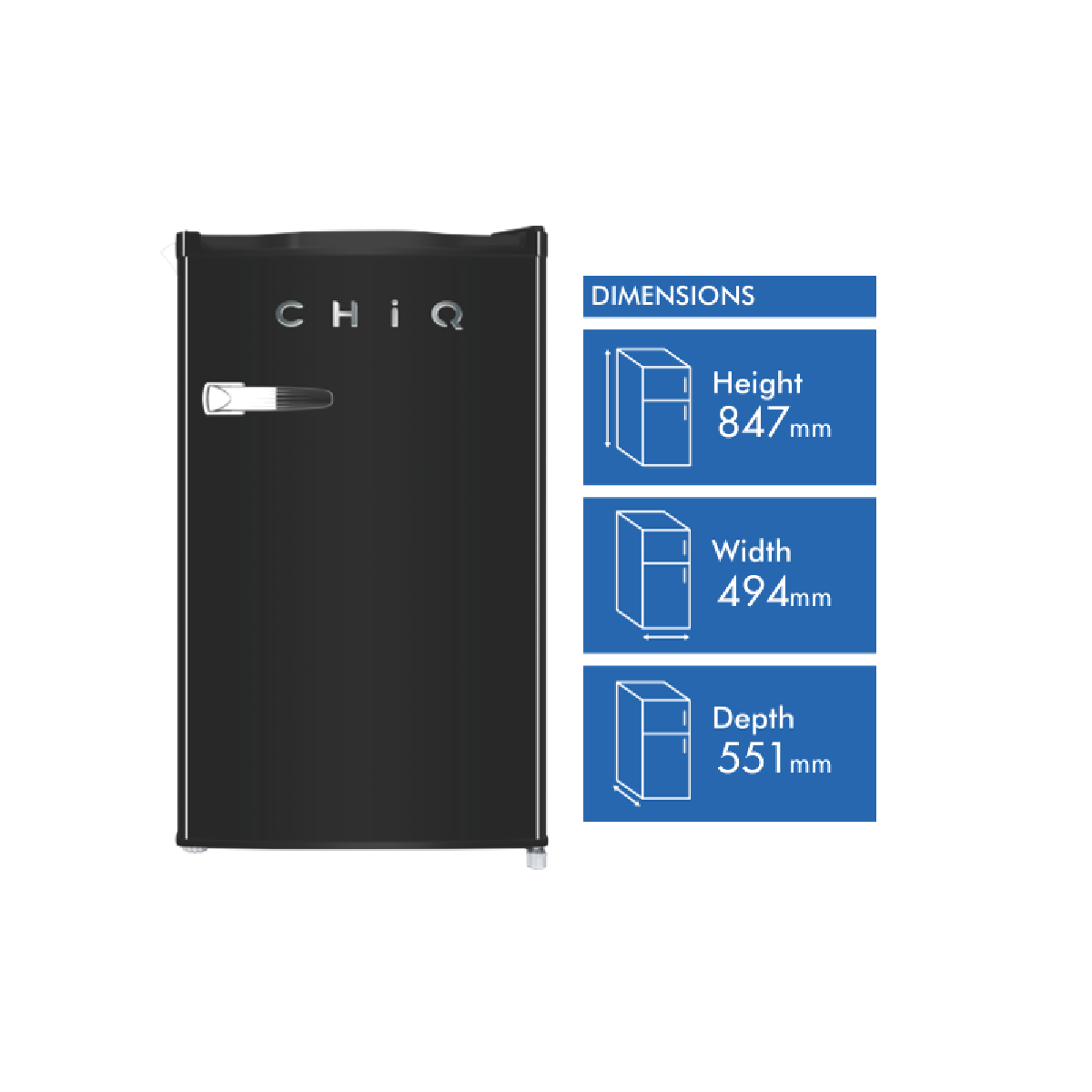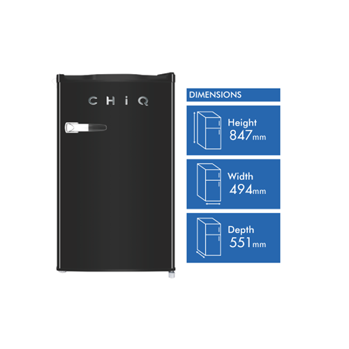 Keep your drinks perfectly chilled with the sleek CHiQ 125L Bar Fridge. This right-hinge black fridge offers ample 110L capacity for storing all your beverages plus a handy 15L freezer for ice cubes and frozen snacks. The adjustable feet metal handle and attachable bottle opener add convenience while the crisp interior LED light ensures you can easily see your drinks. An energy rating of 3.5 stars means this fridge won't cost a fortune to run. Other handy features include the door basket crisper with glass cover reversible door and low noise operation so you can have chilled drinks on demand without disruption. With a width of 494mm height of 847mm and depth of 551mm this bar fridge is ideal for game rooms home bars offices and more. CHiQ backs it with a 3 year warranty for added peace of mind. The manufacturer's part number for this product is CRSR125DB. Give your beverages the chilling they deserve - order the CHiQ 125L Bar Fridge today!