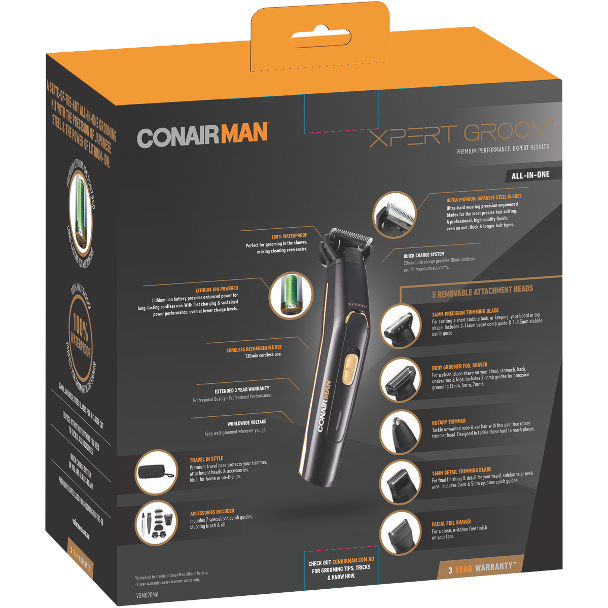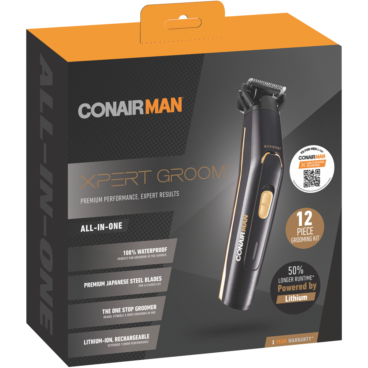 Take your grooming game to the next level with the ConairMan The Xpert Groom Trimmer. This innovative cordless trimmer allows you to achieve a precise tailored trim whether you're wet or dry. The ultra premium Japanese steel blades powered by lithium-ion battery deliver up to 120 minutes of cordless runtime and only need 20 minutes of charging for an instant 20 minute trim session. With a 14mm cutter width this trimmer lets you detail edges shape lines and define contours on your beard body or head. The fully washable design makes cleaning a breeze. Complete with a premium travel case this versatile portable trimmer is perfect for maintaining your style at home or on the go. Backed by a 3 year manufacturer's warranty the ConairMan trimmer brings excellence in grooming and convenience to your daily routine. The manufacturer's part number for this product is VSM890MA.