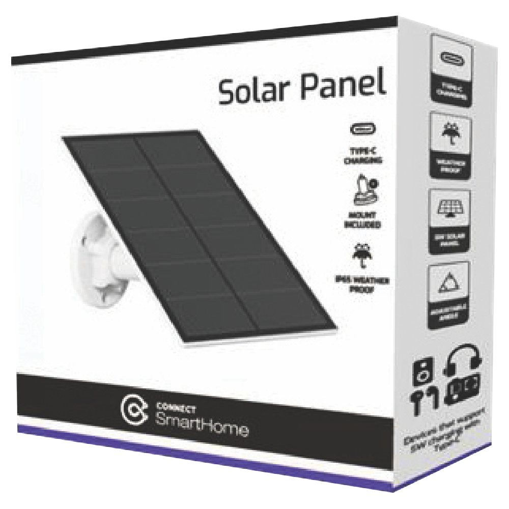 Harness the power of the sun to keep your Connect SmartHome outdoor security cameras charged with the Connect SmartHome 5W Solar Panel. This adjustable white solar panel works seamlessly with all Connect SmartHome battery-powered outdoor cameras allowing you to mount it on a wall or roof to continuously top up your camera battery using natural sunlight. With an IP65 water resistant rating this 287g solar panel stands up to the elements while its adjustable angle positions it perfectly to maximize solar energy collection. Measuring 175mm in height 165mm in width and 20mm in depth the panel's stand enables convenient wall mounting for optimal placement. Harness free solar energy to keep your Connect SmartHome outdoor security cameras powered 24/7 with this innovative solar panel solution. The manufacturer's part number for this product is CSH-ODSLR-5W. Check out the Connect SmartHome 5W Solar Panel to keep your outdoor cameras charged without any wires.