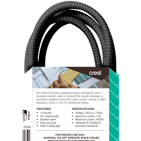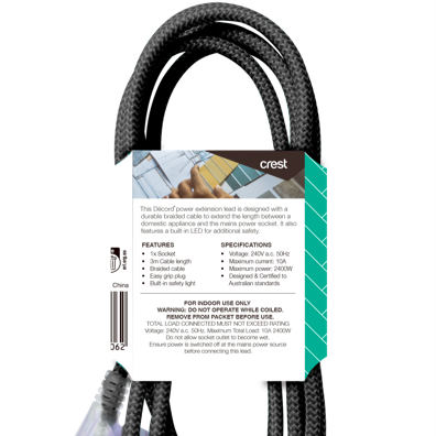 Eliminate extension cord clutter and enjoy convenient power access with the Crest Decord Braided Extension Lead. This 3m black extension cord features a braided exterior for enhanced durability and protection providing the flexibility you need to power devices around your home or office. The compact lightweight design makes storage a breeze when not in use. With safety top of mind integrated overload protection automatically shuts off power to prevent overheating and potential hazards. Whether you need to connect appliances in the kitchen power tools in the garage or charge devices across any room this extension lead has you covered. Rest assured with the included 1 year manufacturer's warranty. The manufacturer's part number for this product is PWK14006. For convenient safe power access look no further than the Crest Decord Braided Extension Lead.