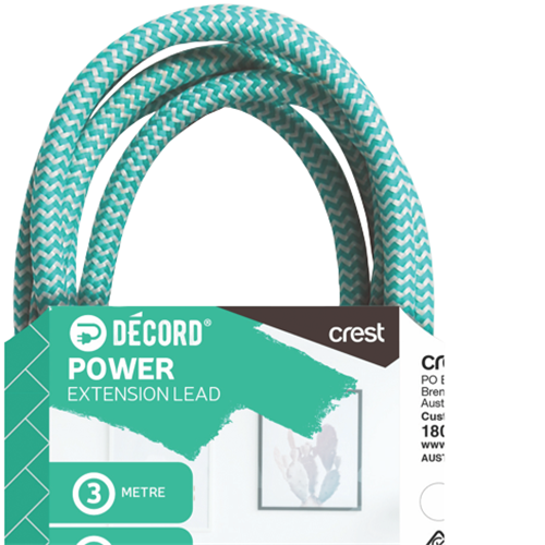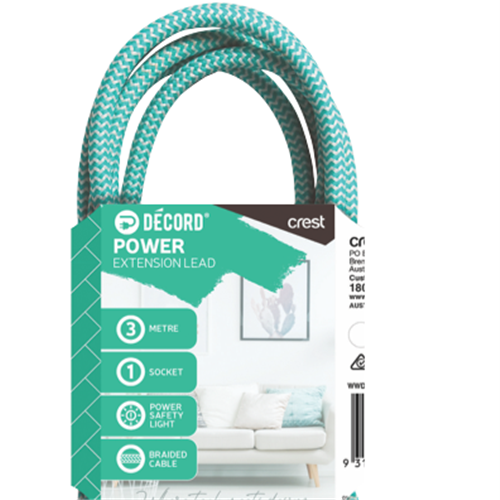 This Crest 3 metre braided extension lead is the perfect solution for extending your power reach. With its durable braided cable and compact plug you can safely and easily connect devices in hard to access areas. The green PVC sheathing lends a subtle pop of colour to blend seamlessly into any space. Whether you need to power appliances in the laundry charge devices outdoors or set up a workstation in the garage this lead allows you to go the distance. The 1 year warranty provides peace of mind with Crest's trusted quality. With handy integrated cable management you can neatly coil any excess cord for a clutter-free setup. For versatile kink-resistant power access that looks as good as it performs choose the Crest 3m braided extension lead. The manufacturer's part number for this product is WWDECEX3. Consider this extension lead to extend power access throughout your home.