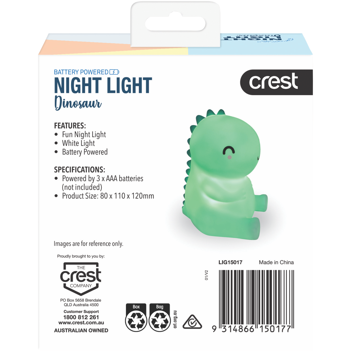 Turn bedtime into a magical adventure with the Crest Dinosaur Night Light. This fun night light projects colorful dinosaur shapes onto walls and ceilings to create a prehistoric wonderland right in your child's bedroom. The soft glow sets the mood for sweet dreams without being too bright. Made from durable plastic this night light is designed to provide years of reliable use. The auto shut-off feature ensures the light turns off automatically if accidentally left on to prevent unnecessary energy waste. Bring some dino delight to your little one's overnight routine with the Crest Dinosaur Night Light. The manufacturer's part number for this product is LIG15017. Check it out today for your child's bedroom.
