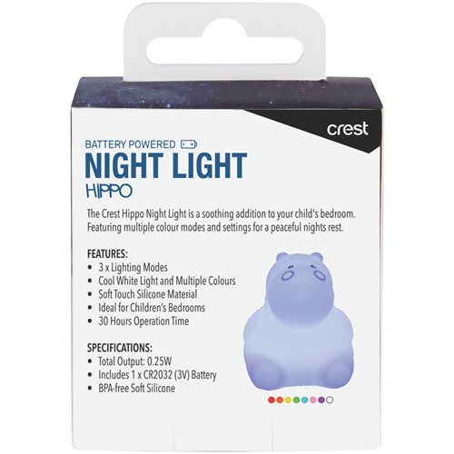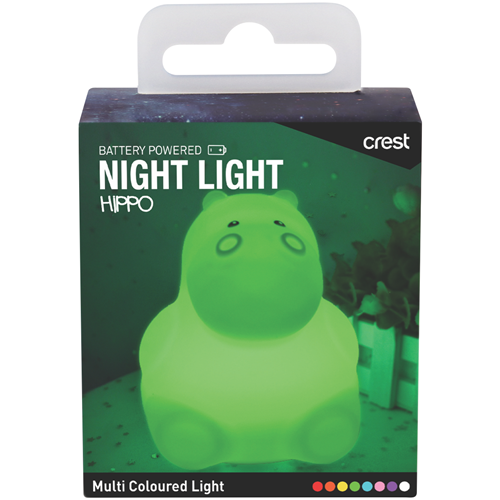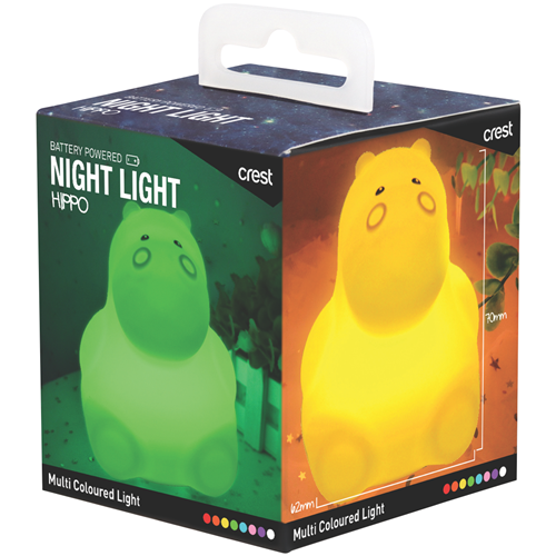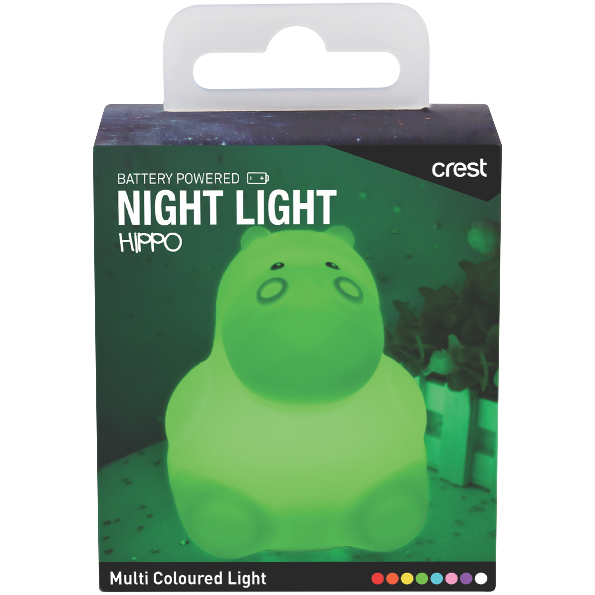 Slip into silent slumber with this adorable Crest Kids Multi-Coloured Mini Night Light Hippo that provides a soft glow to comfort little ones at bedtime. Crafted in the shape of a delightful hippo this night light projects a soothing multi-coloured display on walls and ceilings to create a tranquil environment for your child's bedroom. The compact design is ideal for small hands and packs neatly away during daytime adventures. With an integrated light sensor the hippo automatically turns on when dusk falls to guide restless tots back to the land of nod without disruption. This handy nighttime companion offers the perfect level of illumination for midnight trips or reading bedtime stories. Durable and long-lasting the Crest Kids Night Light Hippo will provide up to 10000 hours of operation for years of reliable service. Covered by a 1 year manufacturer's warranty this cute critter night light comes ready to plug in easing bedtime blues and giving parents peace of mind. The manufacturer's part number for this product is CHPONLBC. Help your little one drift off to sleep with the adorable Crest Kids Multi-Coloured Mini Night Light Hippo.