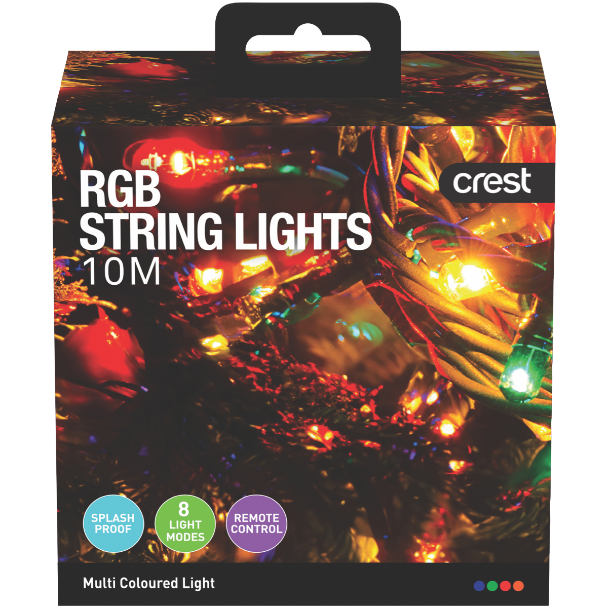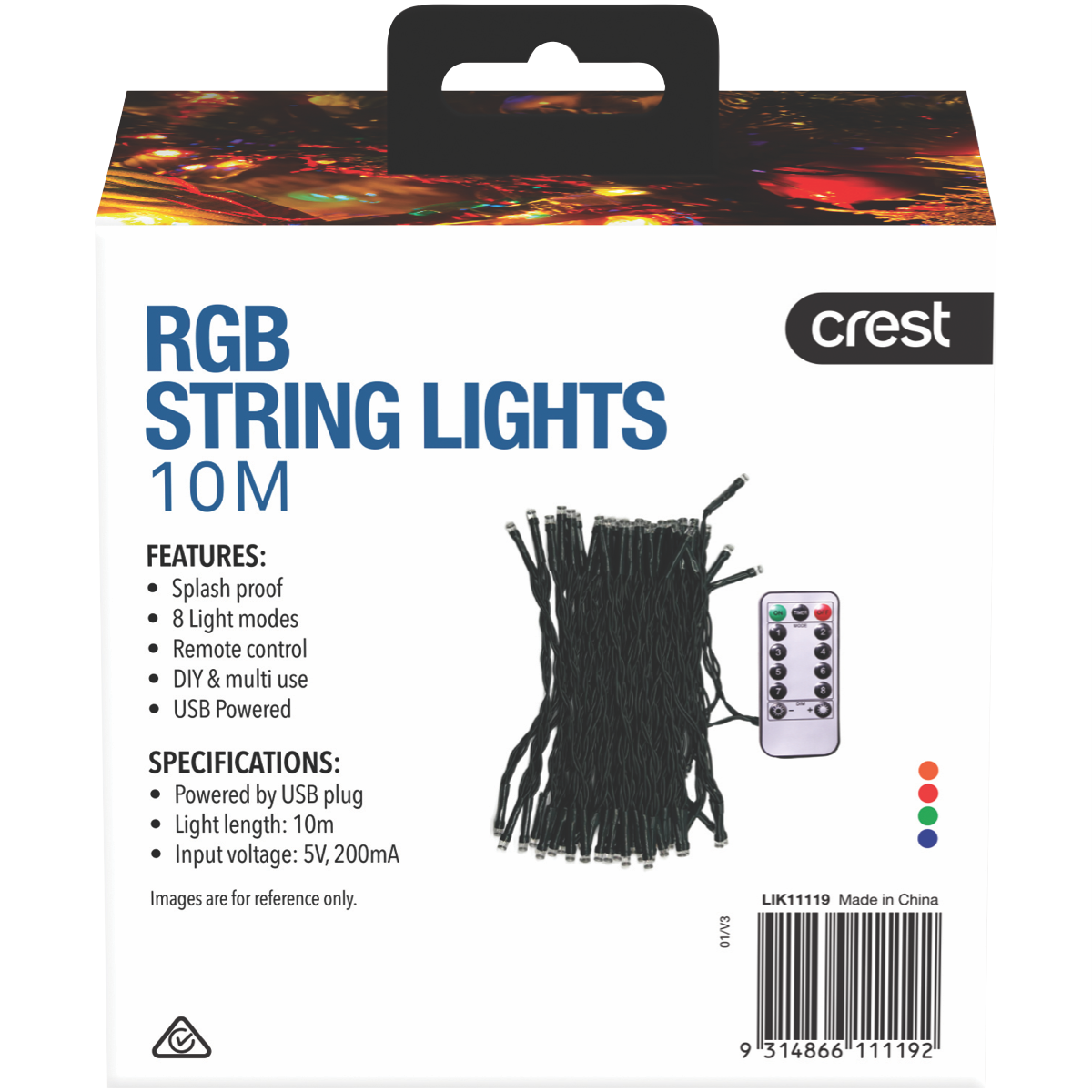 Brighten up your home with seasonal cheer using the Crest RGB Christmas String Lights. This 10-metre long set of USB-powered LED lights is perfect for decorating your Christmas tree windows or outdoor spaces with a festive glow. The multi-coloured lights can be set to display a variety of colours and lighting effects with the easy-to-use remote control allowing you to create a customised Christmas light show. Made with durable weather-resistant materials these Christmas string lights will provide seasons of cheer. With a 1-year manufacturer's warranty you can decorate your home with confidence knowing these lights are made to last. Spread some holiday spirit throughout your home this Christmas with the Crest RGB Christmas String Lights. The manufacturer's part number for this product is LIK11119.