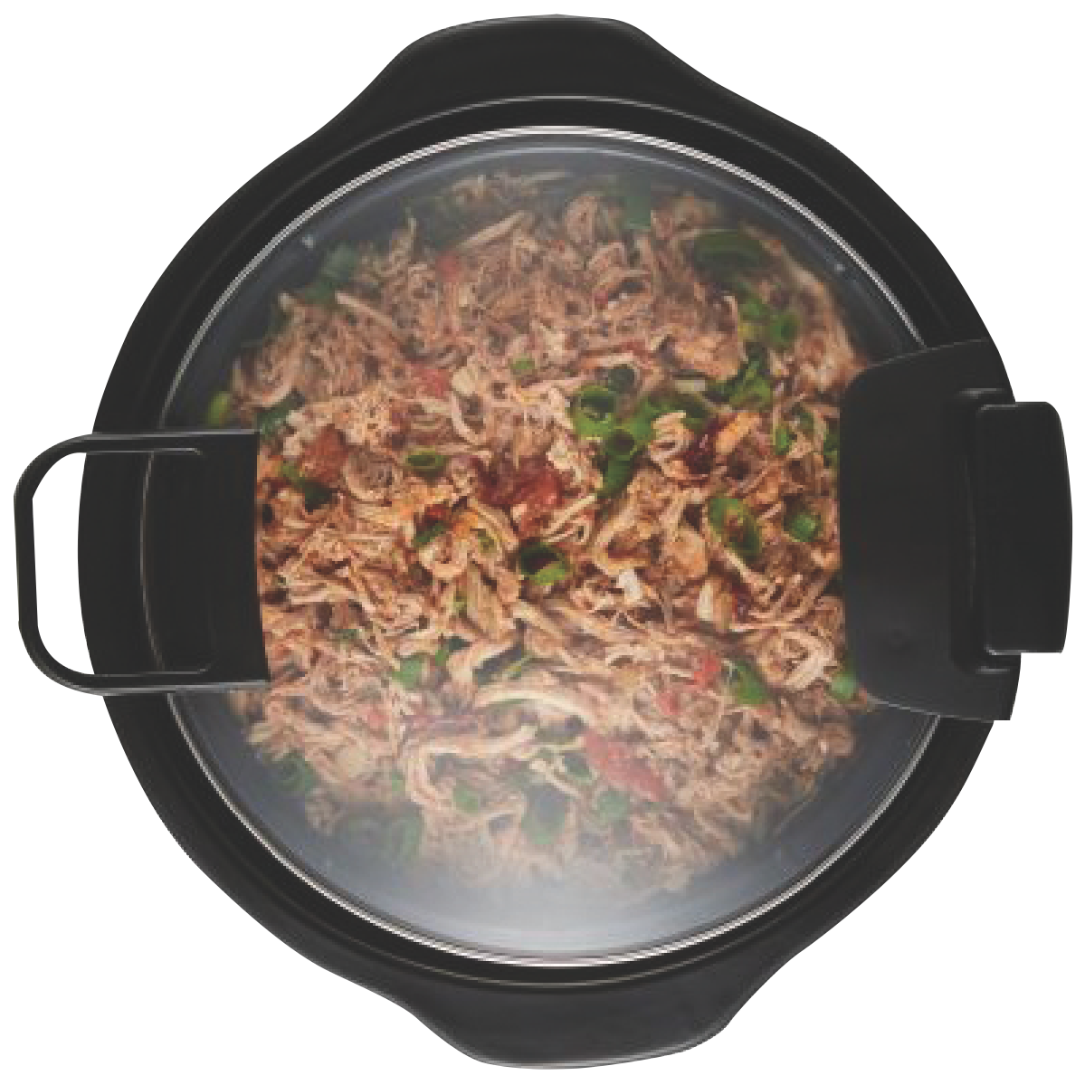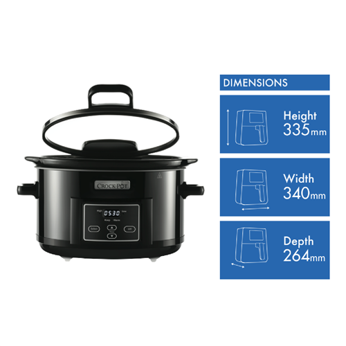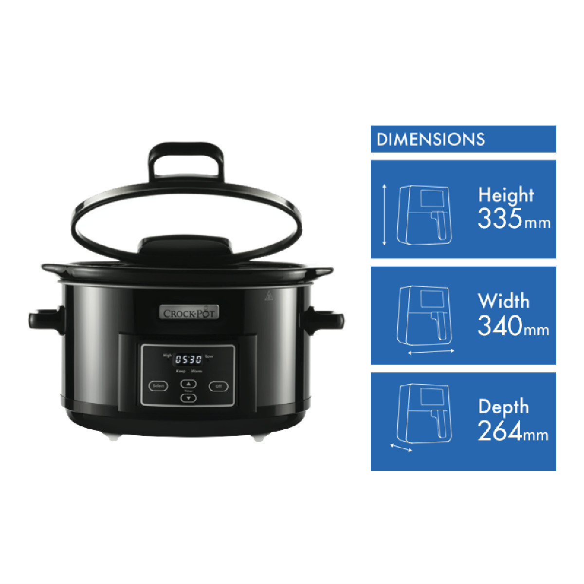 Additional Features Comfortably serves four people, 90cm cord length, Round Crock shape for even cooking, User friendly labelled control panel (no icons), Hinged lid allows one-handed serving and clean benchtop, Dishwasher-safe pot and lid