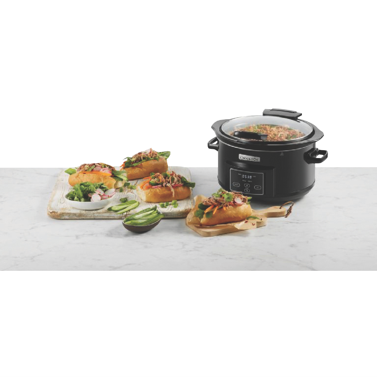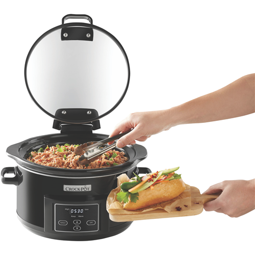 Simplify your cooking with the Crock Pot 4.7L Hinged Slow Cooker. This versatile slow cooker features a round ceramic pot and hinged lid for effortless serving and clean up. With a generous 4.7 litre capacity it comfortably serves four people. Set cooking times from 30 minutes up to 20 hours on the digital control panel. Choose from High Low or Auto Keep Warm settings to achieve the perfect results. The lid opens with one hand for safe spill-free serving. Both the dishwasher-safe pot and lid make cleaning up after dinner a breeze. Cook stews curries soups and more with ease thanks to the even heating of the round crock pot shape. With a 90cm cord length you can conveniently use this slow cooker anywhere in your kitchen. Rely on this user-friendly slow cooker from a trusted brand to deliver delicious family meals. The manufacturer's part number for this product is CHP550. Consider the Crock Pot 4.7L Hinged Slow Cooker for fuss-free home cooking today.