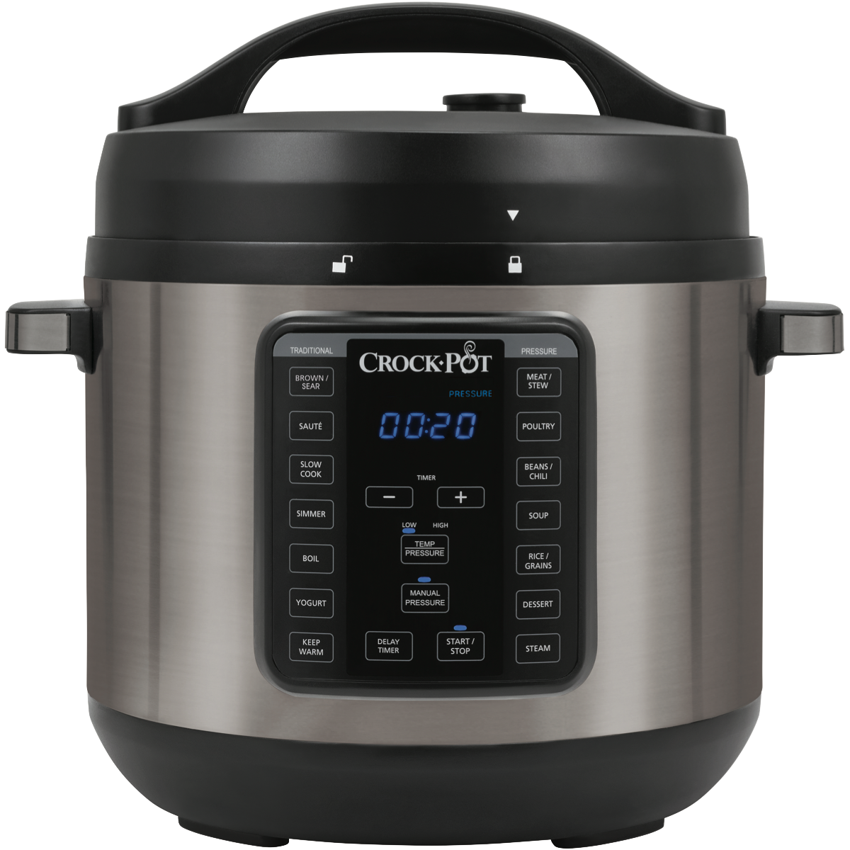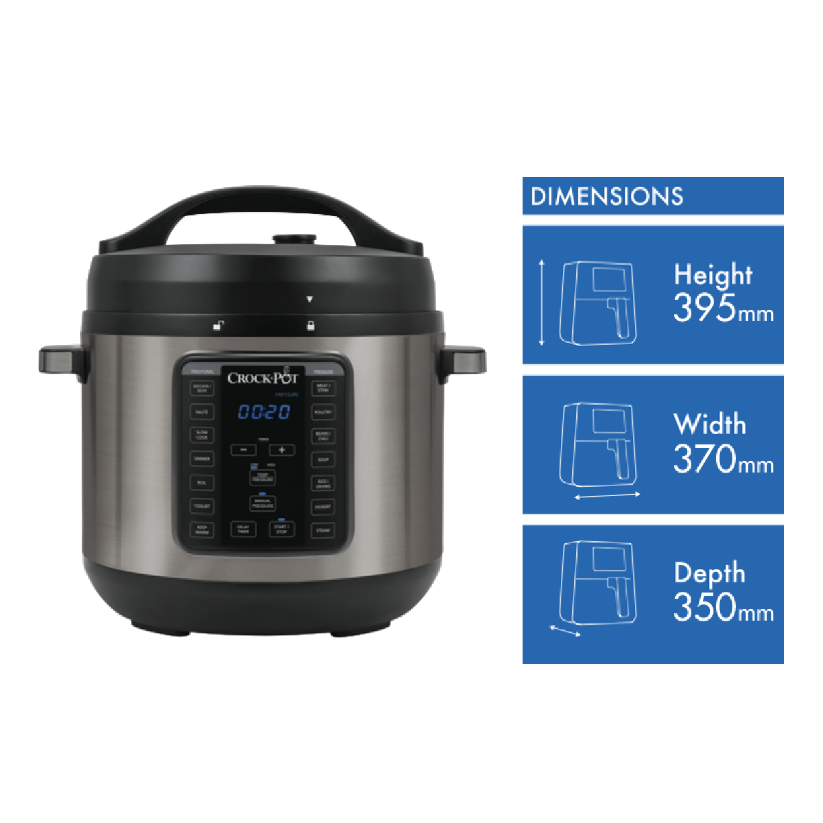 Elevate your cooking with the Crock Pot Express Crock XL Multi Cooker. This versatile 7.6L multicooker makes meal prep a breeze with 7 one-touch meal functions to perfectly cook meats poultry beans chilli soup rice grains desserts and yogurt. The dishwasher safe cooking pot and included glass lid allow easy monitoring while manual settings give you complete control. Pressure cook meals up to 70% faster while the keep warm function ensures your food stays ready to serve. With a sleek silver exterior this multicooker features a 1300 wattage and settings to brown sauté simmer boil and steam. The larger 7.6 litre capacity is ideal for feeding the whole family. Unlock endless possibilities with the ability to pressure cook slow cook sear sauté and more. The included recipe book provides inspiration while the measuring cup and steam rack add convenience. With 1 year warranty the Crock Pot Express Crock XL Multi Cooker streamlines cooking so you can spend less time in the kitchen and more time enjoying delicious meals with loved ones. The manufacturer's part number for this product is CPE300. Bring home the versatility of the Crock Pot Express Crock XL today.