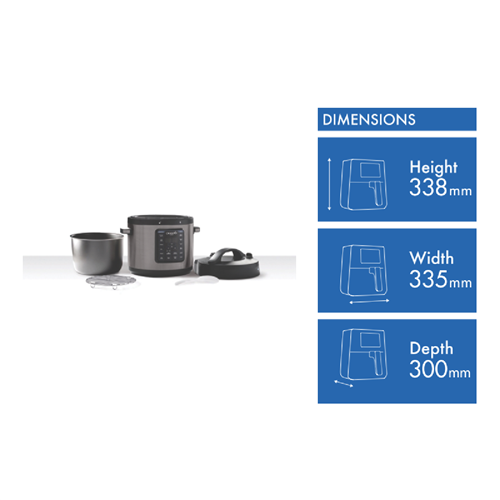 Programs Brown/Saute, Slow Cook, Simmer, Boil, Yoghurt, Keep Warm, Manual Pressure, Meat/Poultry, Beans/Chili, Soup/Stew, Rice/Grains, Dessert, Steam