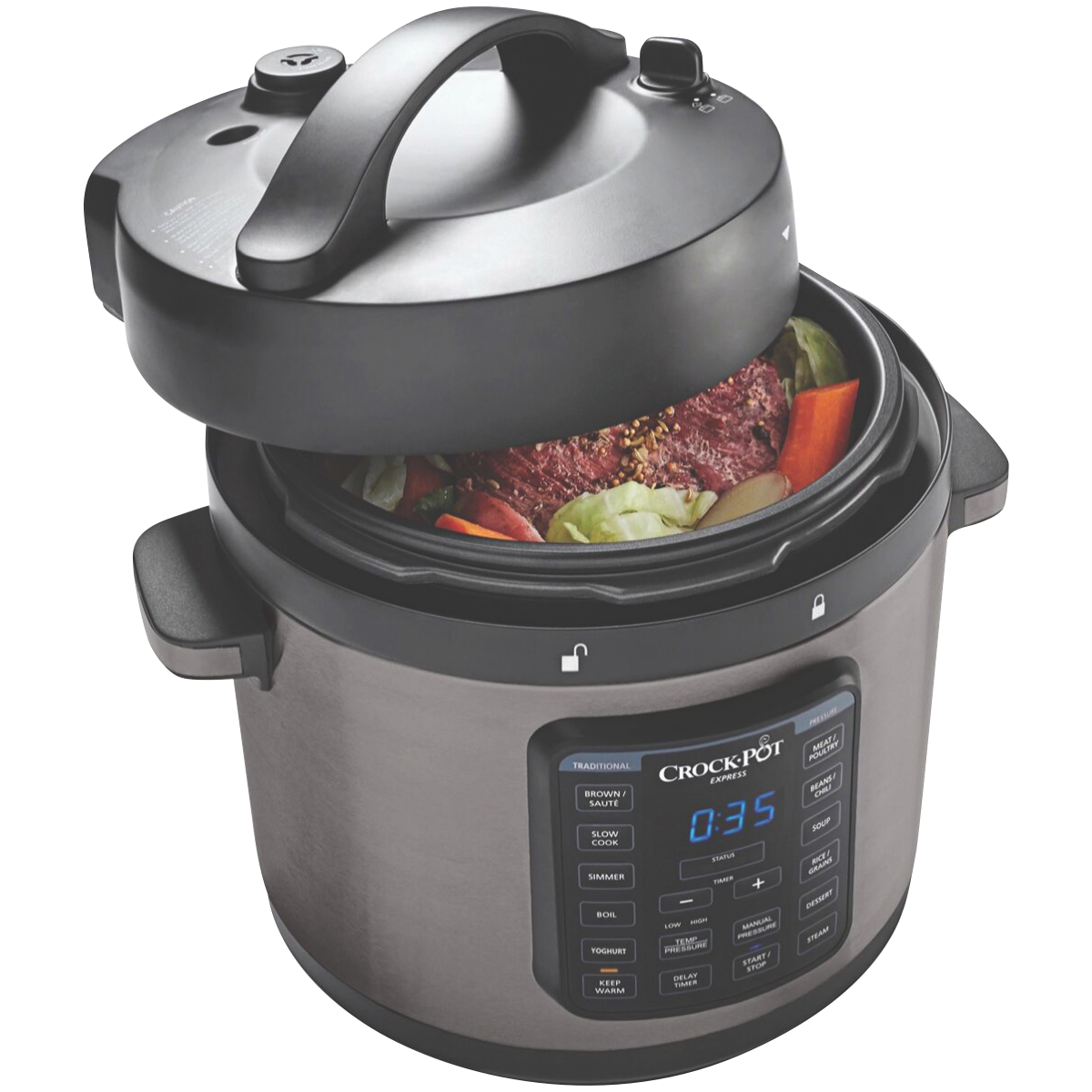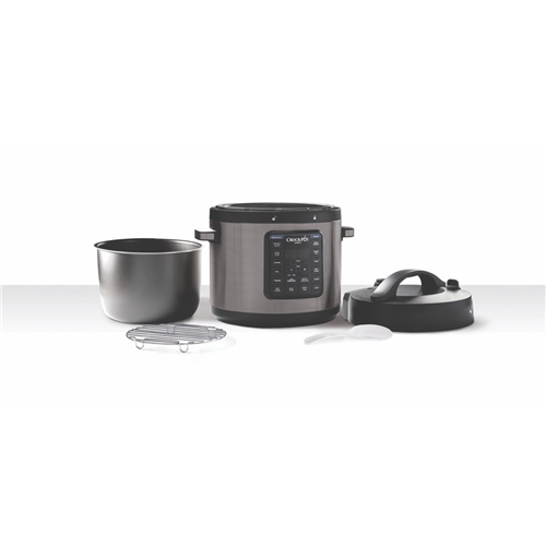 Take your kitchen skills to new heights with the versatile Crock-Pot Express Easy Release 5.7L Multi-Cooker. This powerful 1000W stainless steel multicooker replaces 8 appliances with preset programs for pressure cooking slow cooking steaming sautéing and more. The easy-to-use digital controls and delay start let you schedule meals up to 24 hours in advance. The airtight locking lid stays safely locked until pressure is released and the steam release dial keeps hands away from hot steam. With a dishwasher-safe non-stick pot this multicooker makes cooking and clean up a breeze. Whip up stews roasts rice and more with the press of a button. Spend less time in the kitchen and enjoy delicious home cooked meals with the family. The manufacturer's part number for this product is CPE210. Bring home the Crock-Pot Express Easy Release Multi-Cooker and unlock a world of convenient flavorful meals.