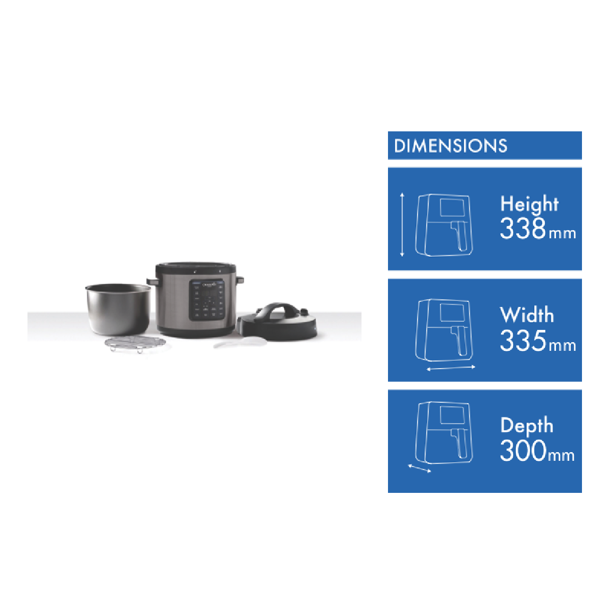 Additional Features Status bar tracks the pressurisation %26amp; pre-heat progress, Removable non-stick cooking pot is dishwasher-safe
