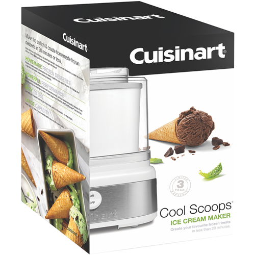 Craft homemade frozen treats with ease using the Cuisinart Cool Scoops Frozen Dessert Maker. This ice cream maker features a heavy-duty motor and efficient design to churn out smooth and creamy gelato sorbet frozen yogurt or ice cream in just 25-40 minutes. The 1.5 litre capacity stainless steel freezer bowl provides plenty of space to create delicious frozen desserts for the whole family. Simply add your ingredients to the mixing paddle lock the transparent lid into place and let the dessert maker do the hard work. The convenient mix-in opening allows you to add in chocolate chips nuts or other tasty mix-ins without interrupting the freezing process. With dimensions of 242mm x 229mm x 286mm and weighing just 4kg this compact appliance can be conveniently stored away when not in use. Cuisinart's double-insulated freezer bowl ensures your frozen treats come out perfectly chilled and ready to eat. Made from durable materials this dessert maker is built to last for years of frozen dessert making. Explore new recipes and satisfy your cravings for ice cream whenever you please with the Cuisinart Cool Scoops Frozen Dessert Maker. The manufacturer's part number for this product is ICE-22XA. Take your pick from Cuisinart's range of dessert makers today.