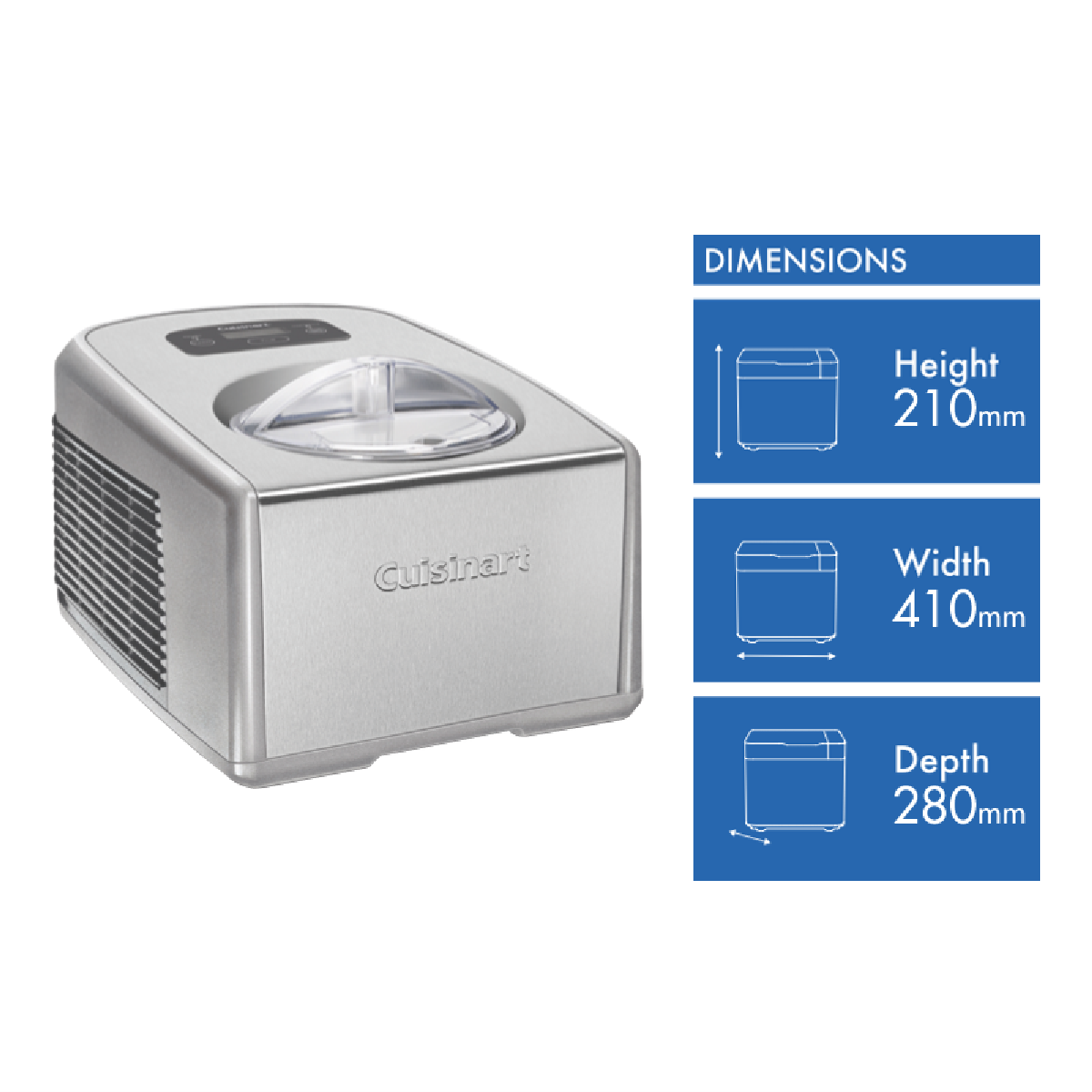 Indulge your inner gelato and ice cream artisan with the Cuisinart Ice Cream & Gelato Maker. This brushed stainless steel machine is equipped with an in-built 1.5 litre freezer to churn up to 2 litres of frozen desserts in as little as 20 minutes. The easy-to-use touchpad control panel features preset programs an automatic timer and handy keep-cool function. Simply add your ingredients to the mixing bowl select your settings and let the Cuisinart work its magic. The transparent lid allows you to watch the mixing process as it happens. Included accessories like the gelato paddle provide the perfect consistency while the opening in the lid lets you add in chocolate chips nuts or other mix-ins as desired. With a powerful 240V built-in compressor this Cuisinart ice cream maker delivers fast efficient freezing for smooth and creamy results. Craft everything from classic vanilla to cookies and cream strawberry or even lemon sorbet. The sleek stainless steel finish looks great on any countertop. Experience gourmet homemade frozen desserts with the Cuisinart Ice Cream and Gelato Maker. The manufacturer's part number for this product is ICE-100BCXA. Check it out today.