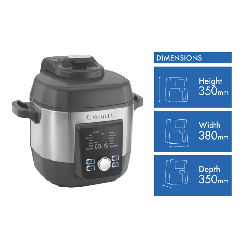 Elevate your home cooking with the Cuisinart Meal Maker High Pressure Multi Cooker. This versatile 5.7L stainless steel pressure cooker makes it easy to prepare delicious one-pot meals for the whole family. With 12 smart programs including pressure cook sauté and slow cook you can cook meats soups grains beans and more at the touch of a button. The intuitive LCD display and digital controls offer precision cooking while the removable cooking pot and dishwasher-safe parts allow for easy cleanup. With 3 pressure settings you can achieve maximum flavor extraction and tender juicy results in a fraction of the normal cooking time. From risottos to curries this multi cooker takes the stress out of getting dinner on the table. With 1000W of power triple safety features and a 2-year warranty the Cuisinart Meal Maker High Pressure Multi Cooker delivers reliable performance you can trust. The manufacturer's part number for this product is CPC-900XA. Consider this multi cooker your new secret weapon for fast fuss-free home cooked meals.