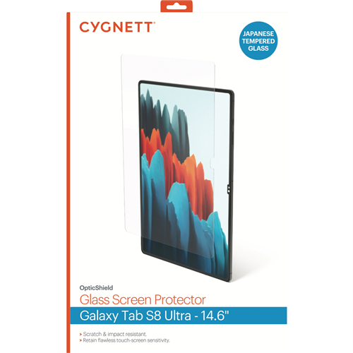 Protect your Samsung Tab S8 Ultra 14.6 tablet in style with the Cygnett Galaxy Tab S9/S8/S7 Ultra Screen Guard. This clear screen protector is specially designed to perfectly fit your Tab S8 Ultra providing full edge-to-edge coverage. Installation is quick and easy - simply align and apply. Once on you can enjoy maximum screen clarity and sensitivity thanks to the protector's ultra-thin 0.51mm depth. Scratch and shatter protection helps keep your Tab S8 Ultra display looking pristine. With its durable construction this screen guard can withstand everyday use and accidents. Rest assured your tablet is guarded against knocks for up to 2 years with the included manufacturer's warranty. For peace of mind when using your Samsung device choose the precision-fit crystal clear protection of the Cygnett Tab S8 Ultra Screen Guard. The manufacturer's part number for this product is CY4021CPTGL.